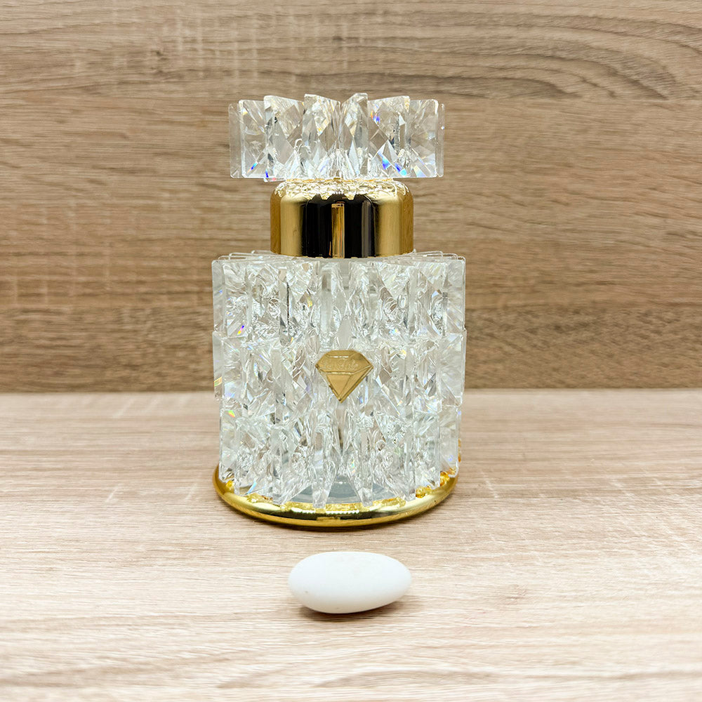 Raffinato Profumatore Elettrico in cristallo trasparente, caratterizzato da una lavorazione sfaccettata che crea splendidi riflessi alla luce. Il design è arricchito da eleganti dettagli dorati che donano un tocco di lusso e classicità.