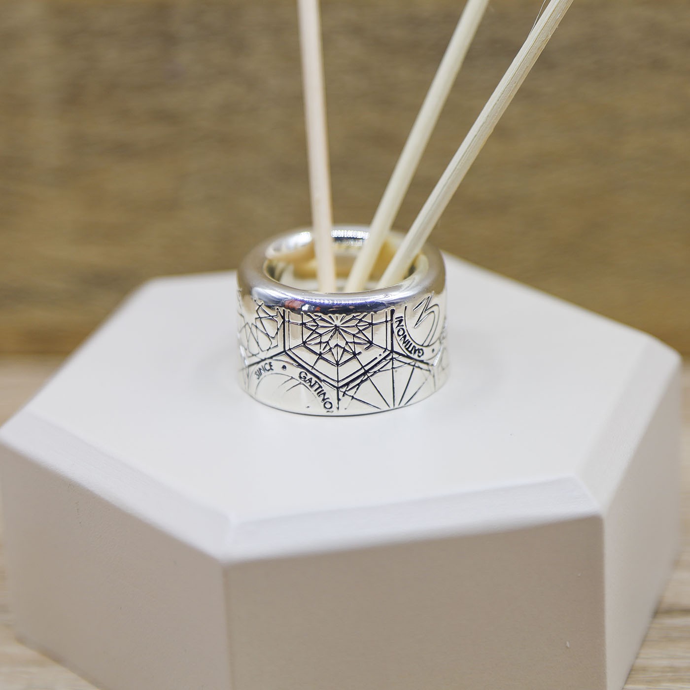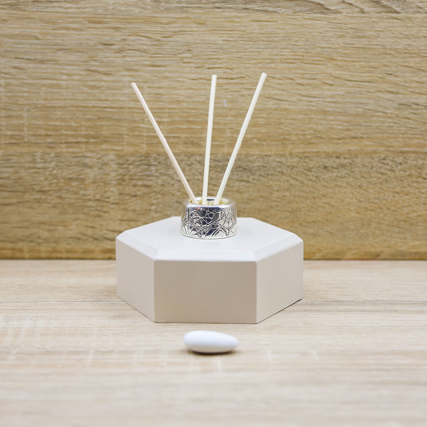 Profumatore esagonale avorio, tappo color argento con decori incisi, firmato Gattinoni.