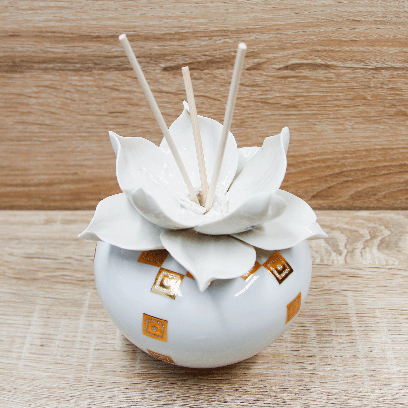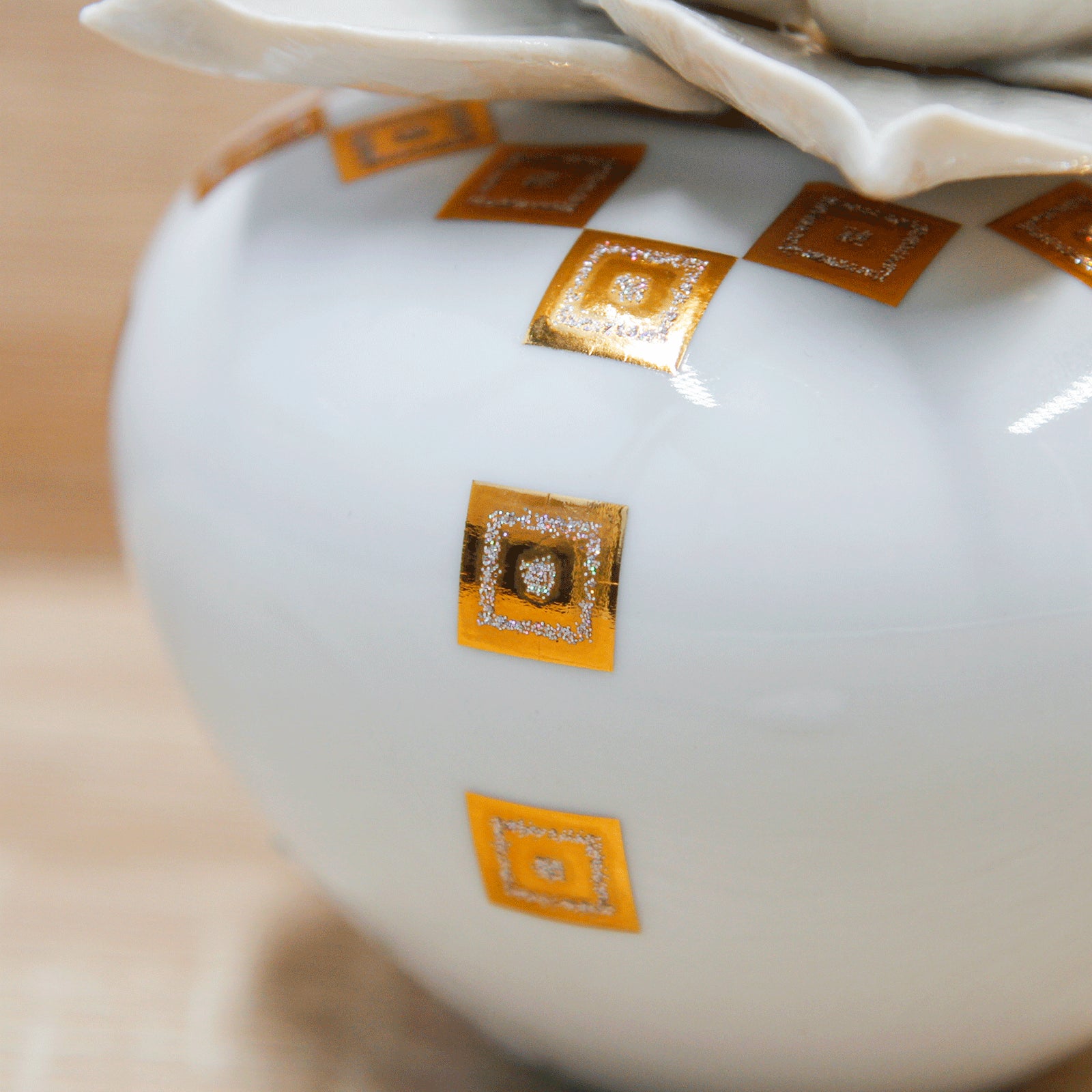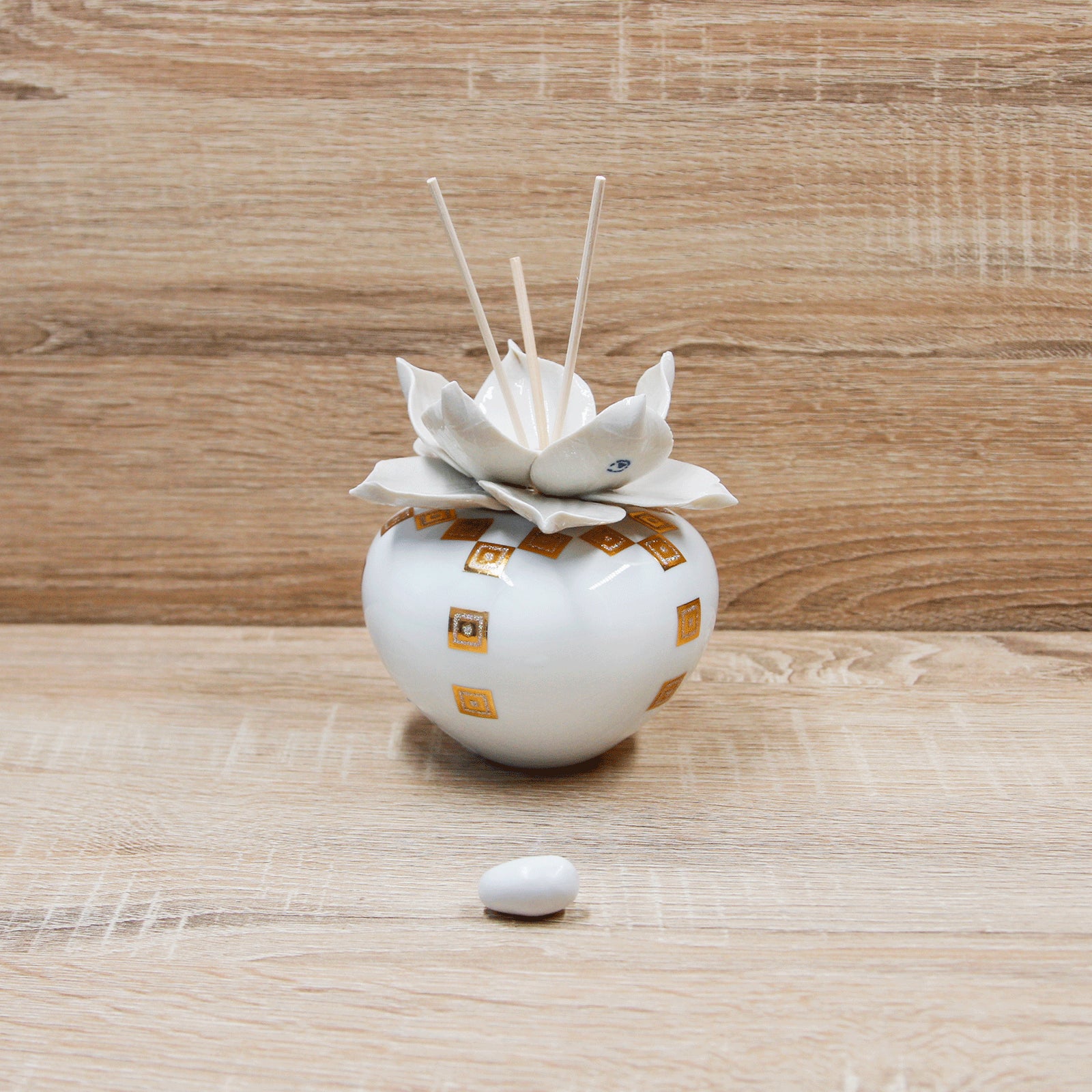 Profumatore Tondo con Fiore in Porcellana con Decoro Geometrico in Oro e Glitter, firmato Caroline