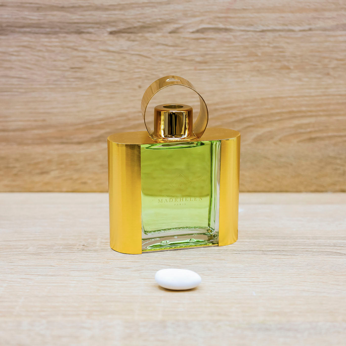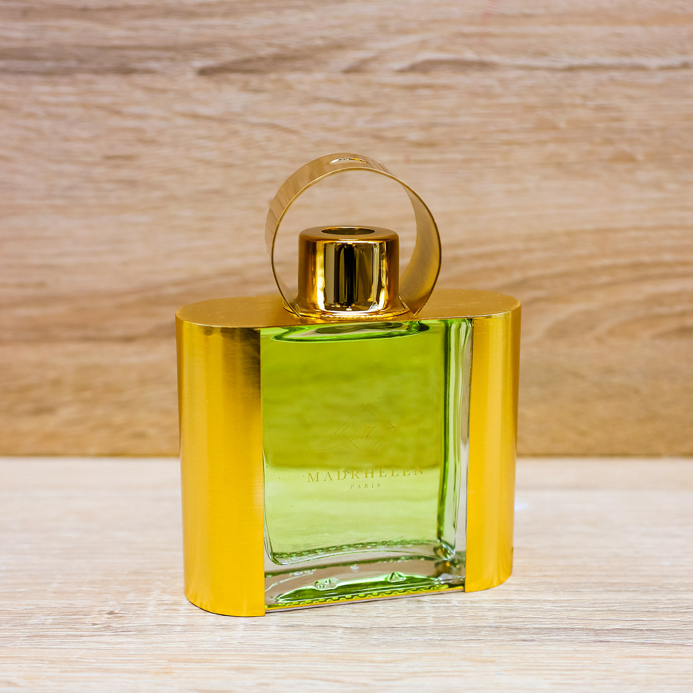 Profumatore d'ambiente di design di color verde e oro, firmato Madrhèlen.