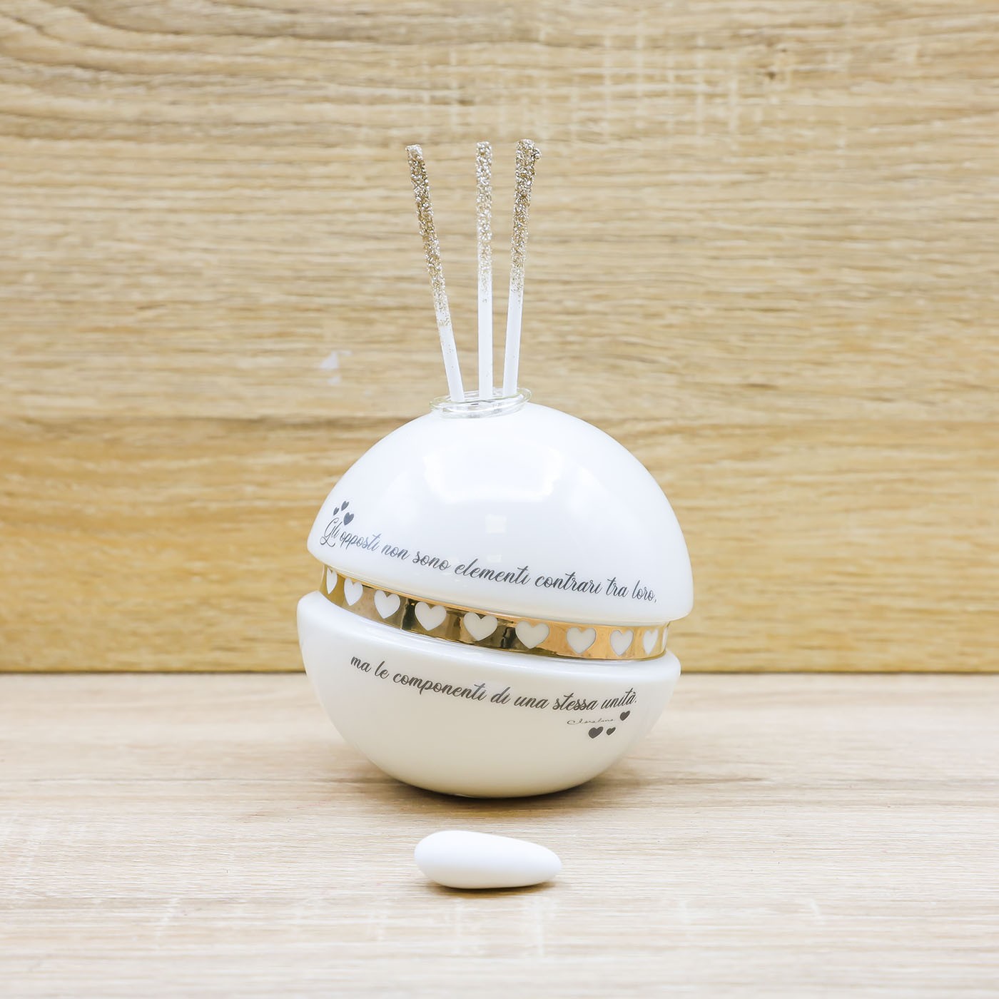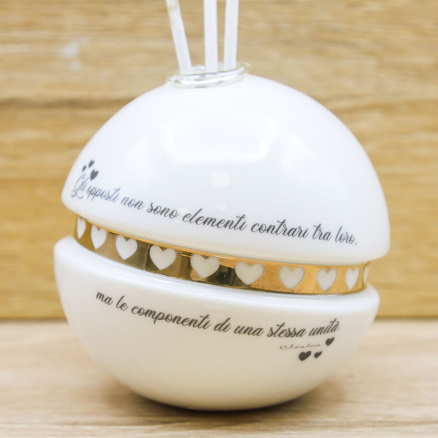 Profumatore a forma di mappamondo con una fascia color oro rosa con cuoricini traforati e frase "Gli opposti non sono elementi contrari tra loro, ma le componenti di una stessa unità", firmato Claraluna.