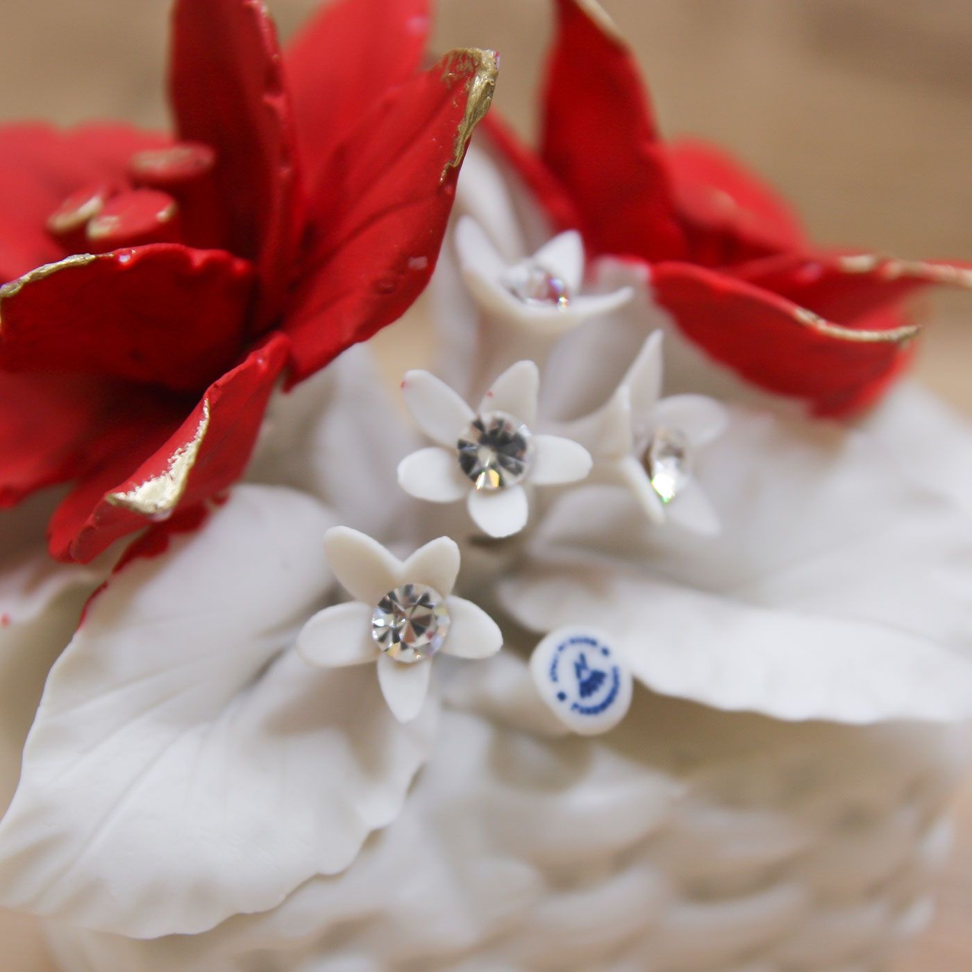Profumatore base rettangolare con due stelle di natale e quattro fiorellini con strass, in porcellana di capodimonte dalla rifinitura matta, firmato Bella Napoli.