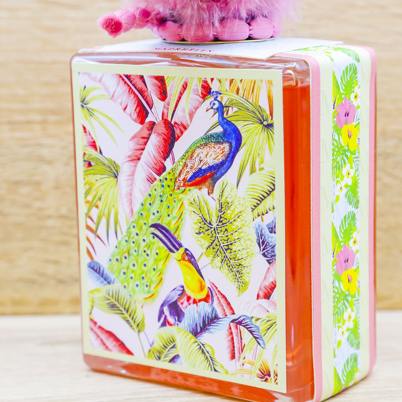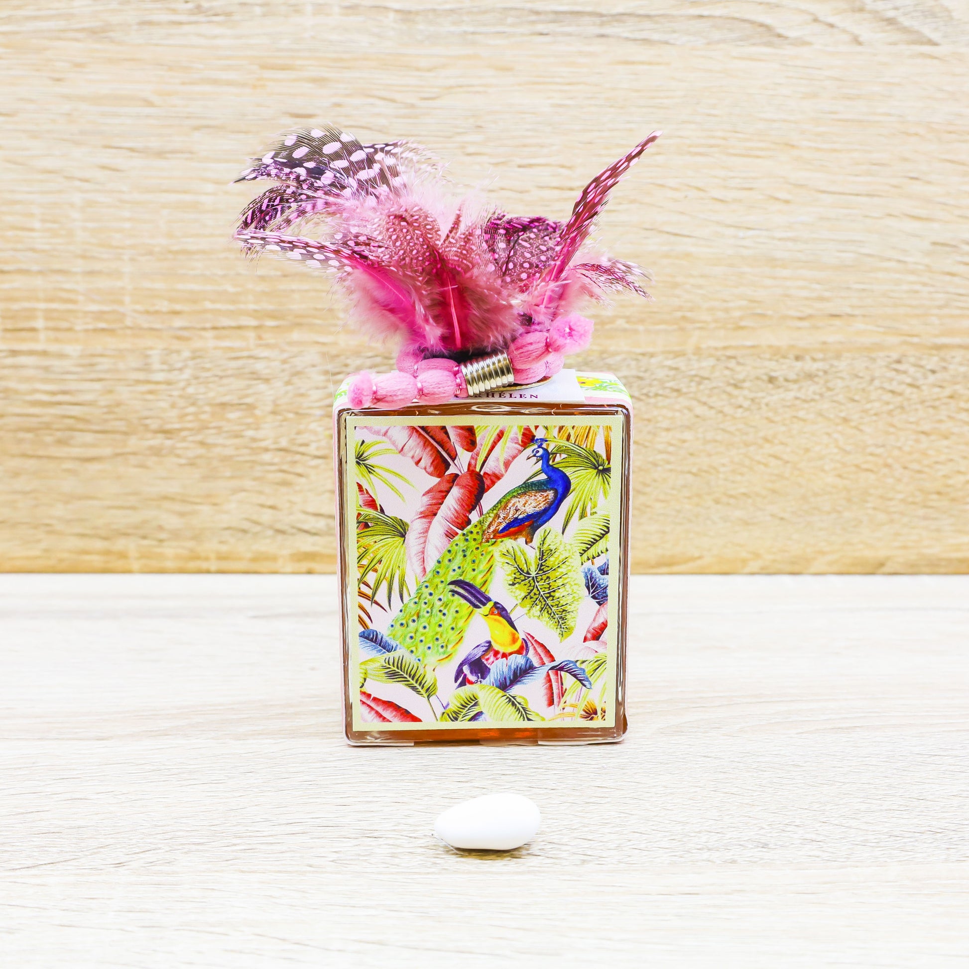 Profumatore dal design unico in vetro rosa rivestito da pelle stampata con decori di pavoni, sul tappo troviamo una bellissima piuma con pois rosa, firmata Madhélen.