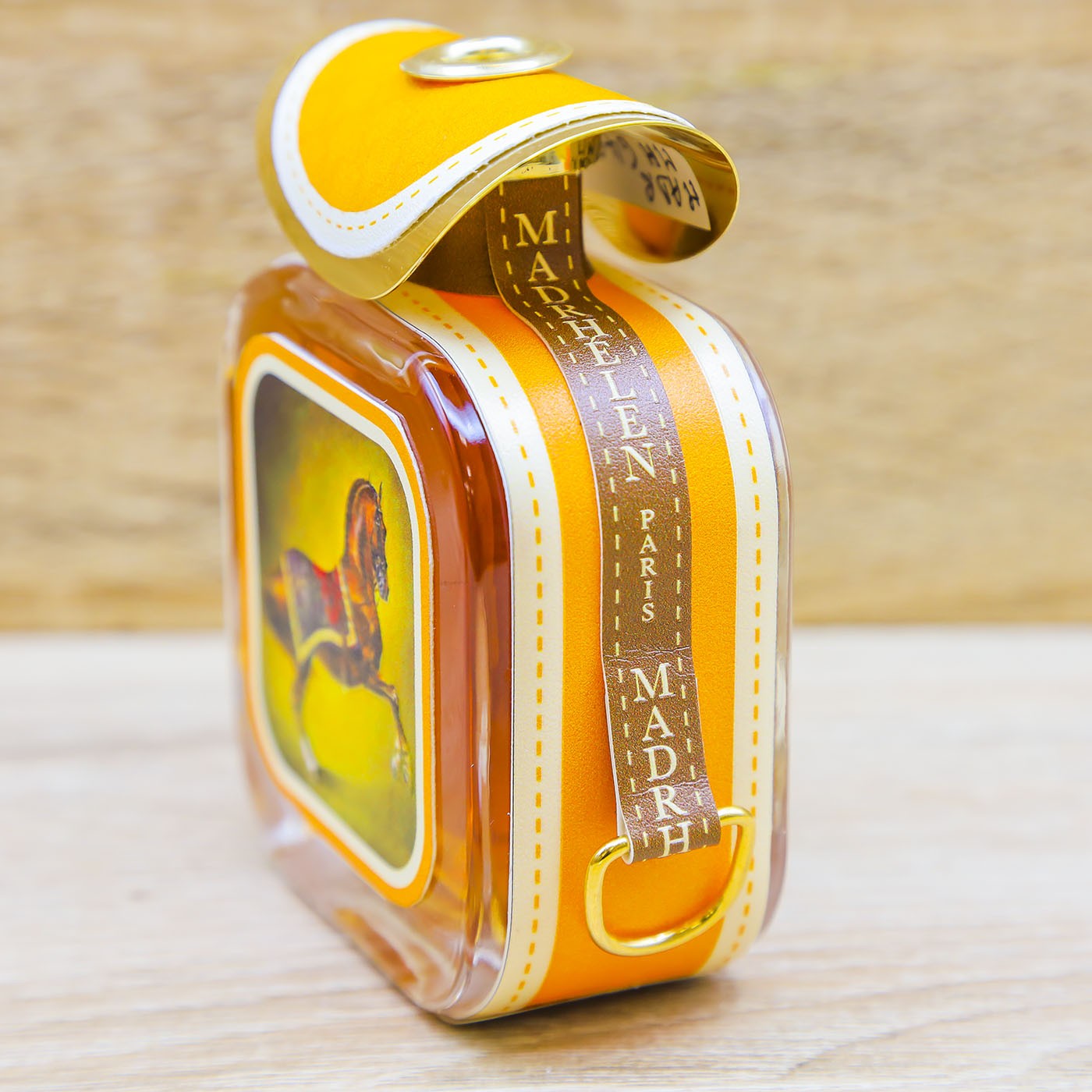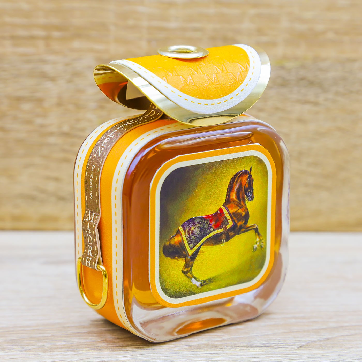 Profumatore in vetro rivestito in pelle con figura di un cavallo e tappo in metallo dorato a forma di sella, firmato Madrhelèn.