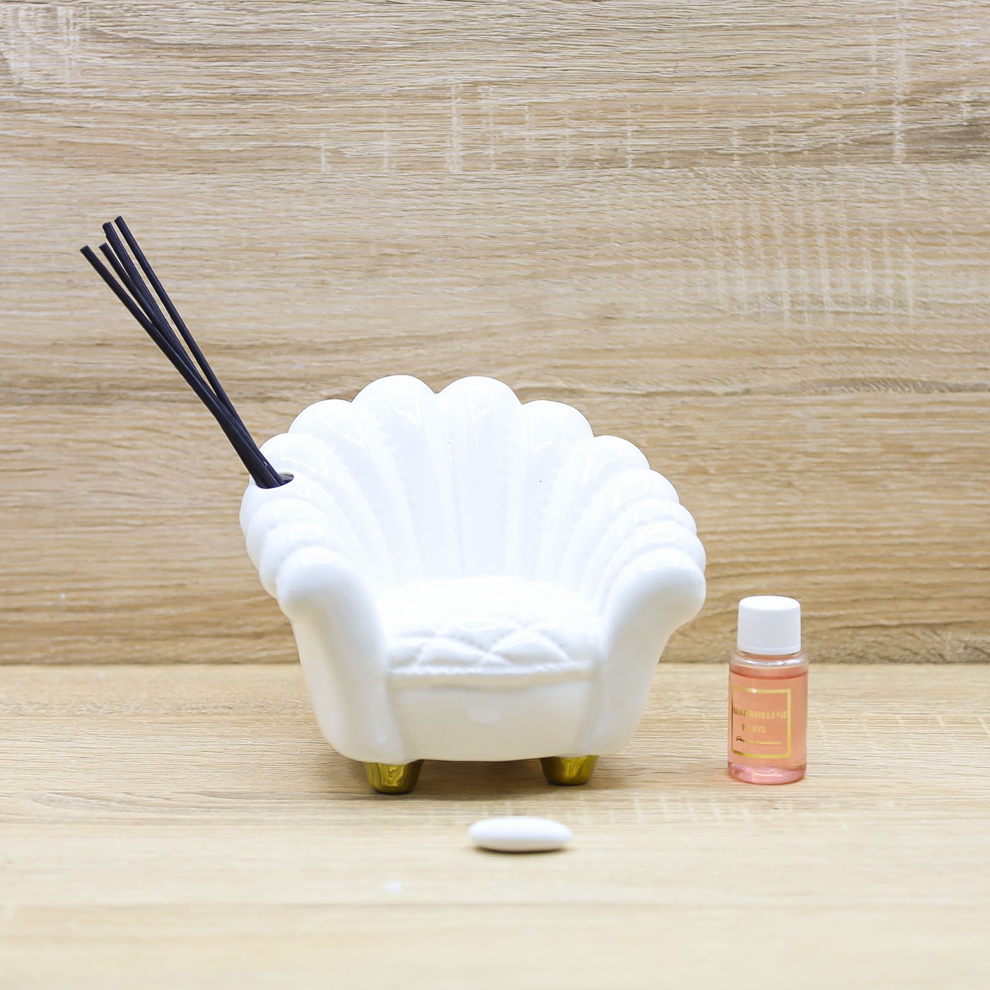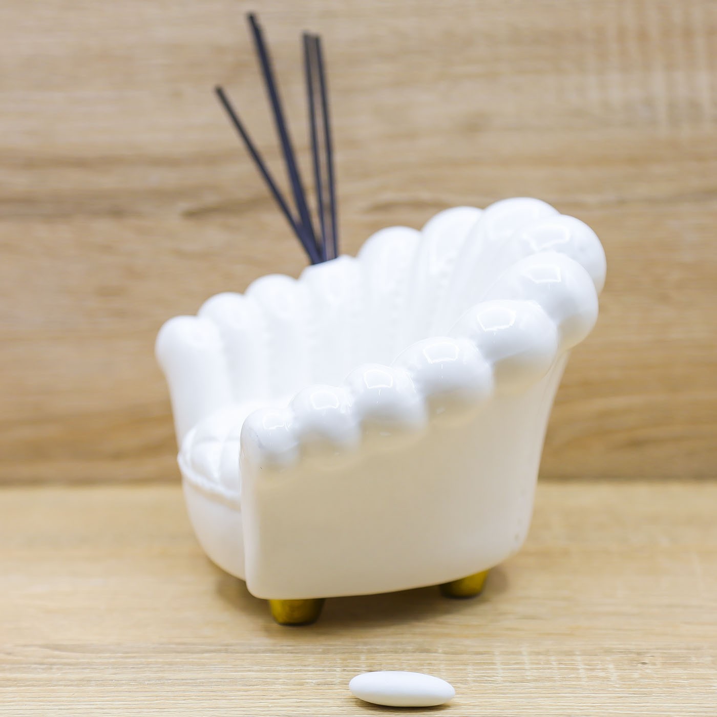Profumatore a forma di Sofà in porcellana, di colore bianco e con decori in oro, firmato Madrhélen.