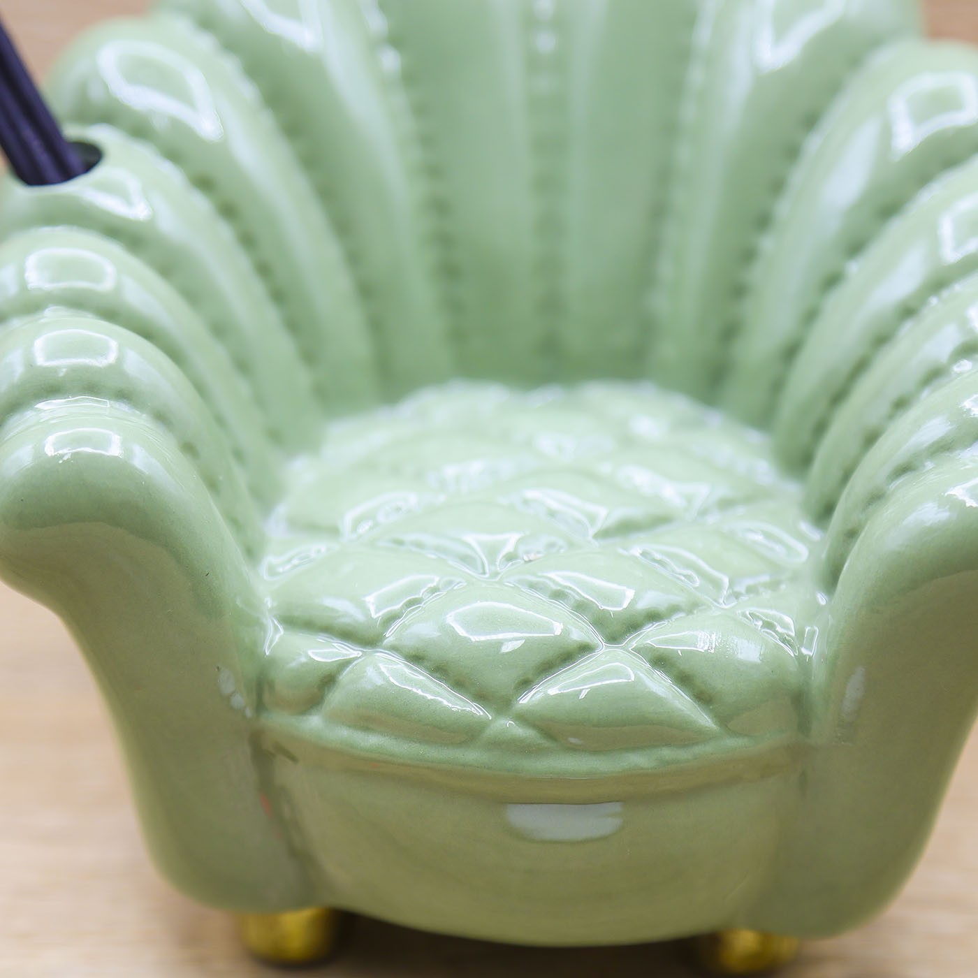 Profumatore a forma di Sofà in porcellana, di colore verde e con decori in oro, firmato Madrhélen.