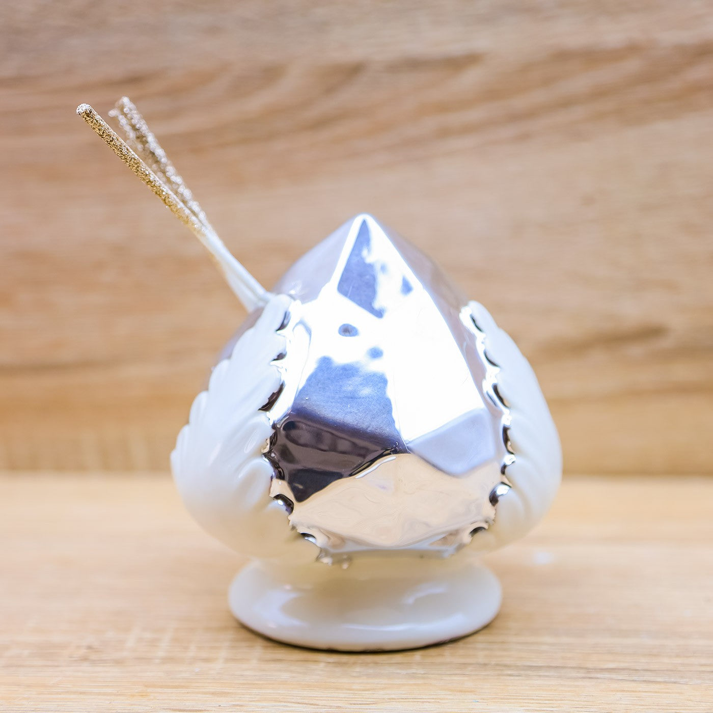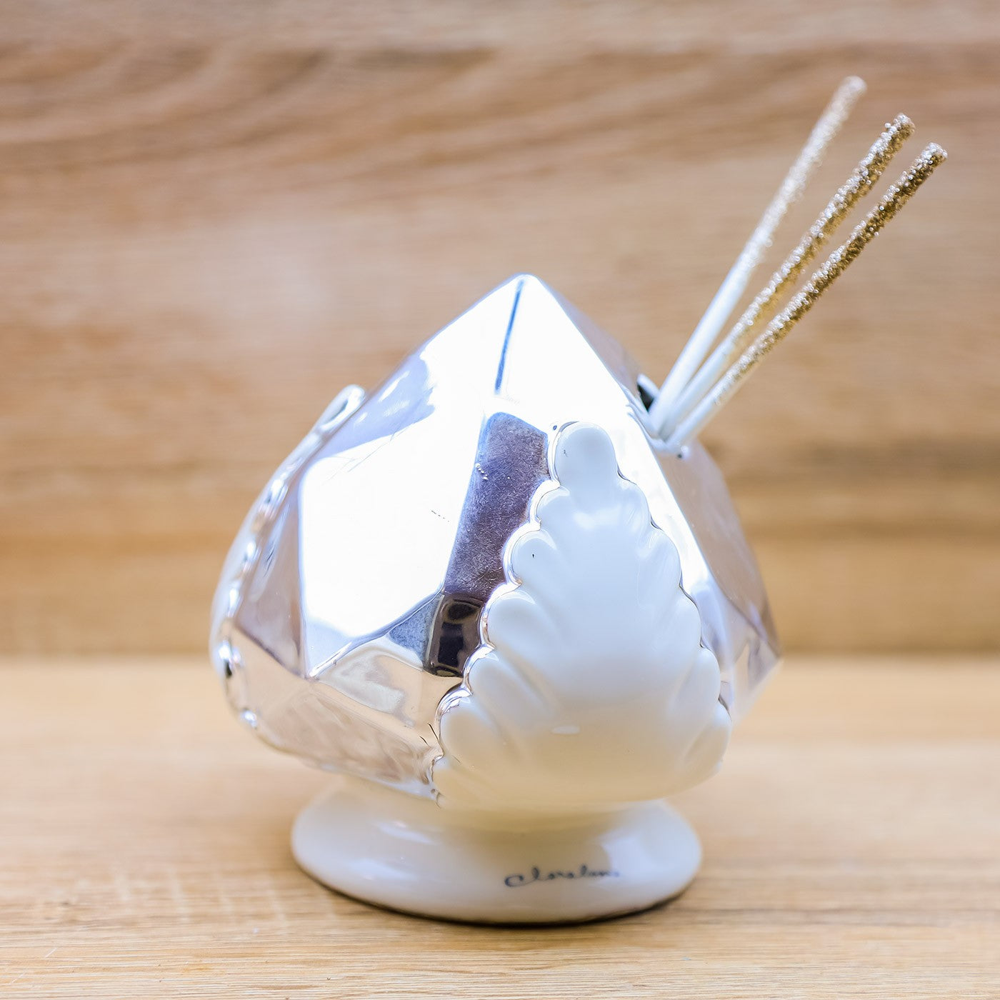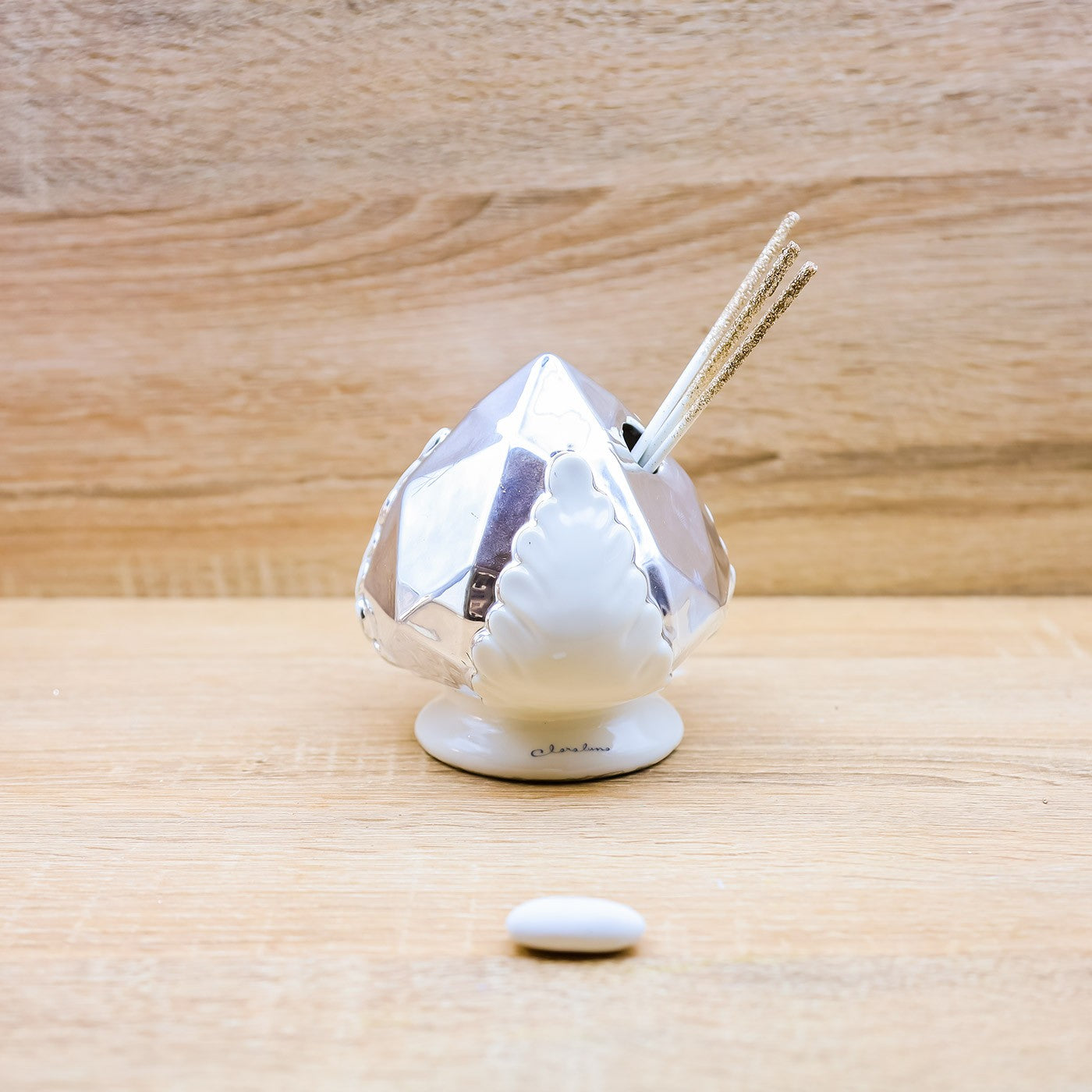 Profumatore a forma di pumo/pigna di colore argento e bianco, firmato Claraluna.