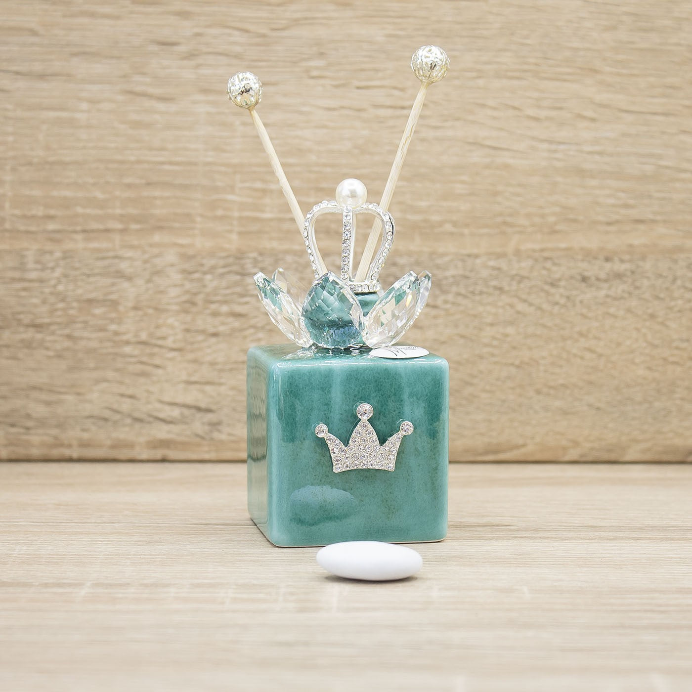 Profumatore in Porcellana di Capodimonte Verde con Corona color Argento con Strass sulla parte anteriore e un'altra Corona con Strass e una Perla posta sulla parte più alta del Profumatore