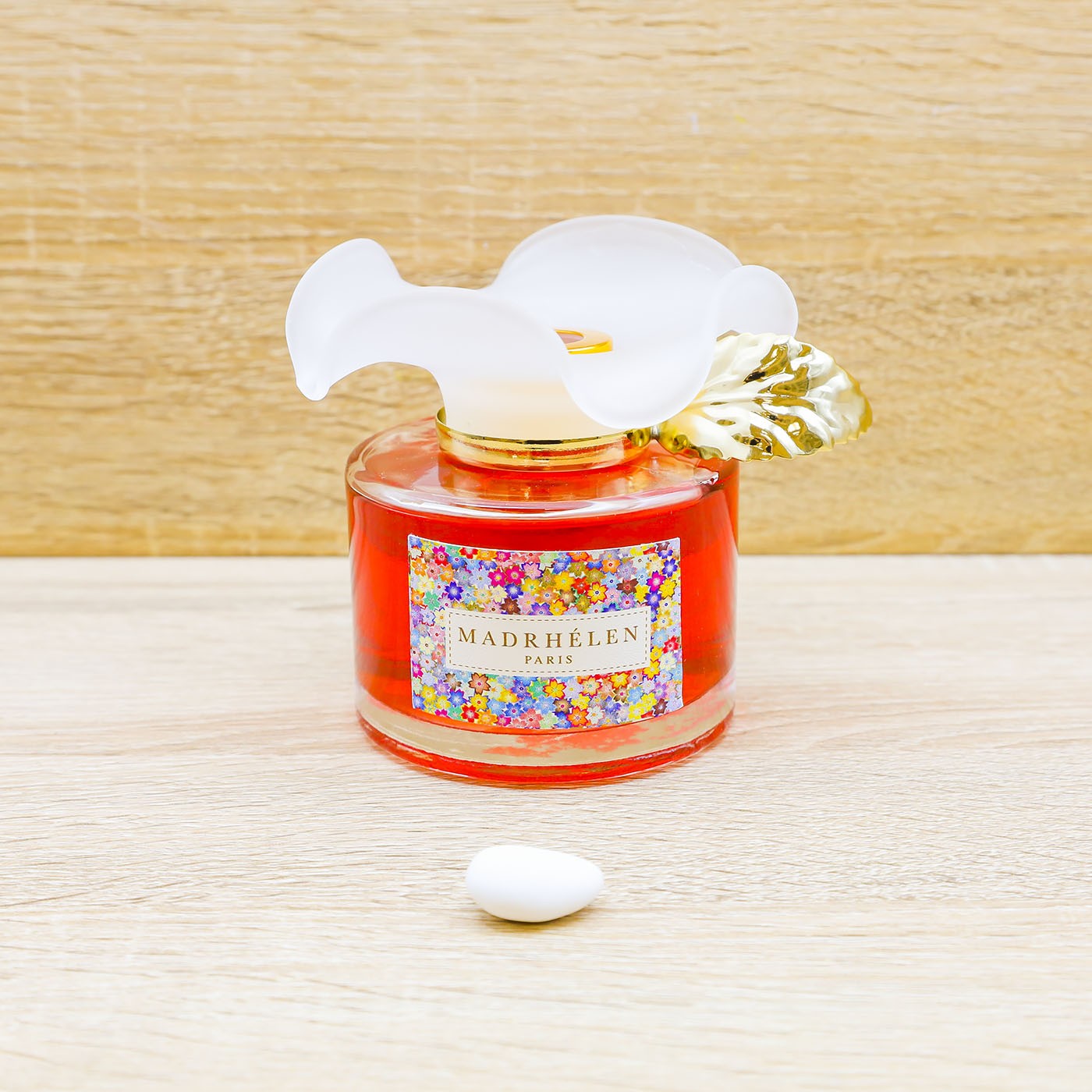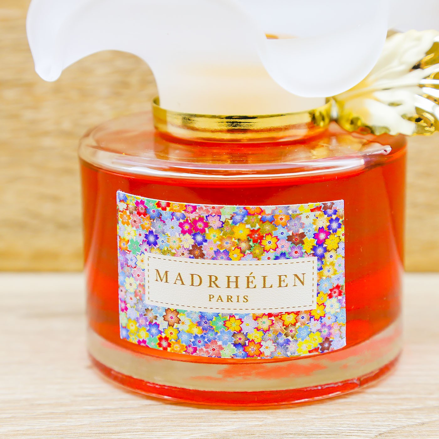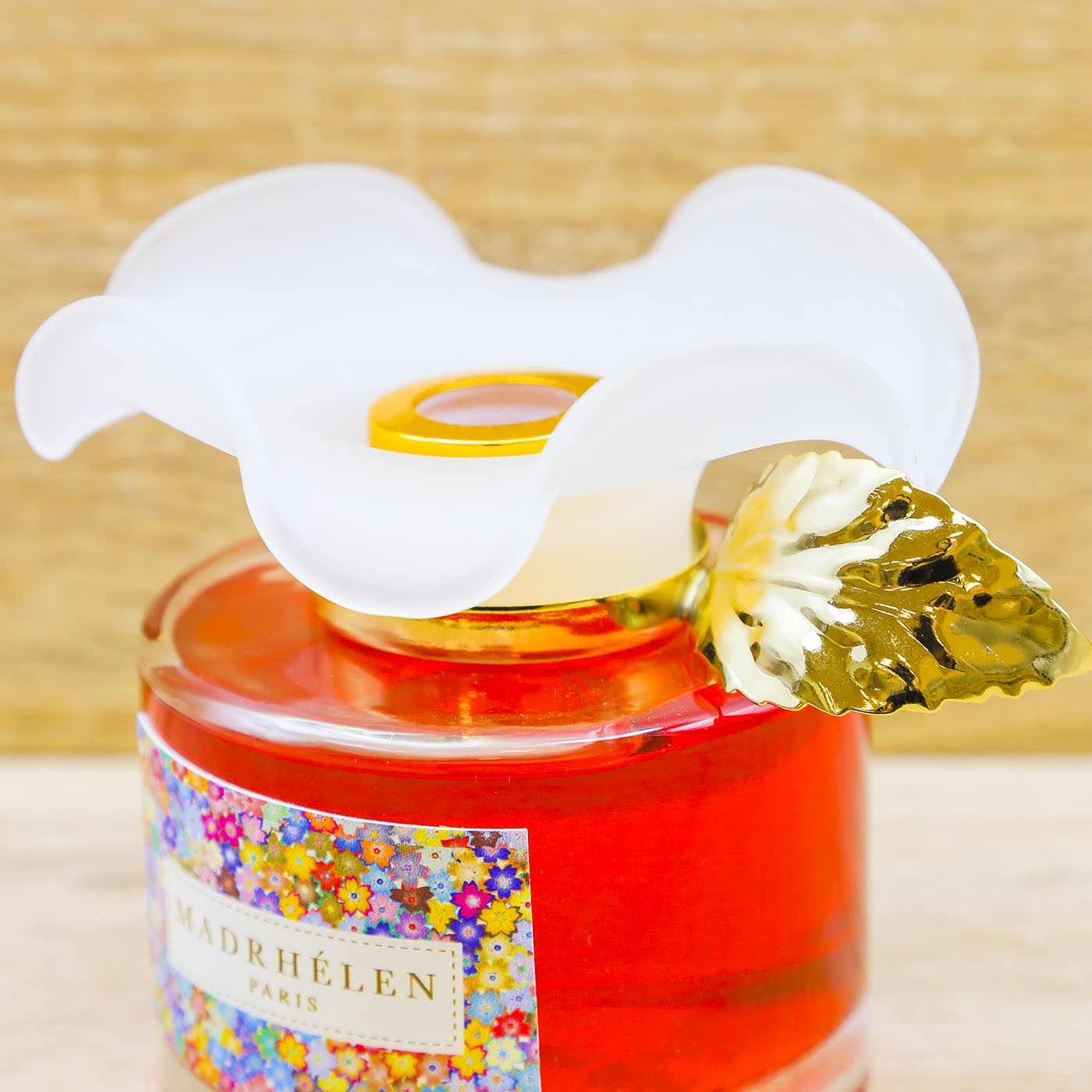 Diffusore ambiente bottiglia in vetro con essenza profumata di colore rosso e tappo a forma di fiore in vetro satinato con foglia dorata, firmato Madhélen.