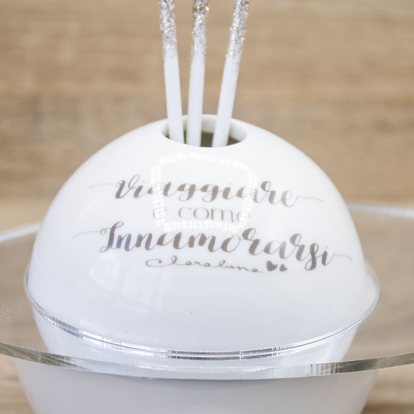 Profumatore tondo piccolo con specchio e frase "Viaggiare è come innamorarsi", firmato Claraluna.