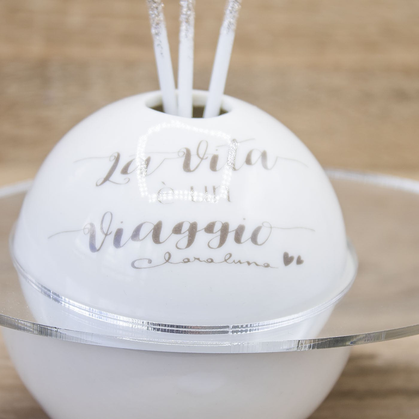 Profumatore tondo piccolo con specchio e frase "La vita è un viaggio", firmato Claraluna.