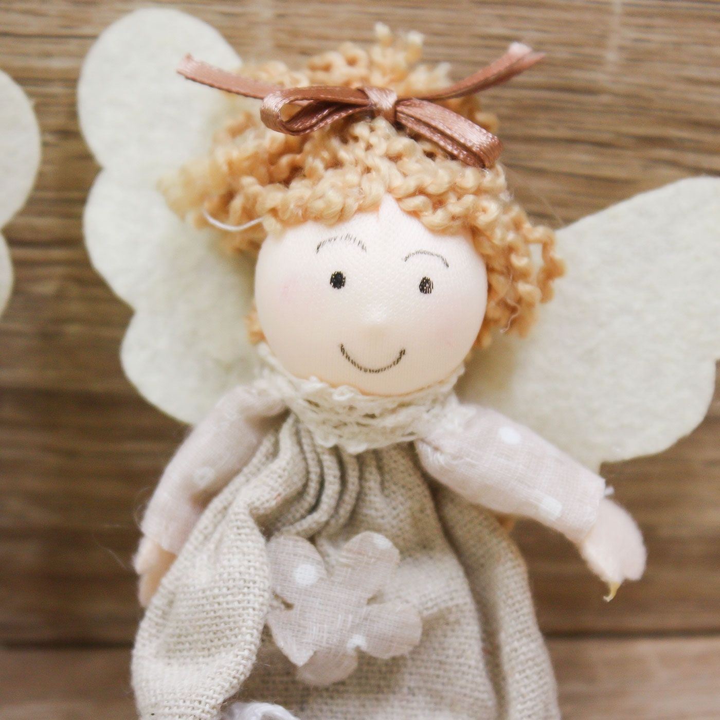 Fatina con vestitino in iuta, ali e fiocco tra i capelli.