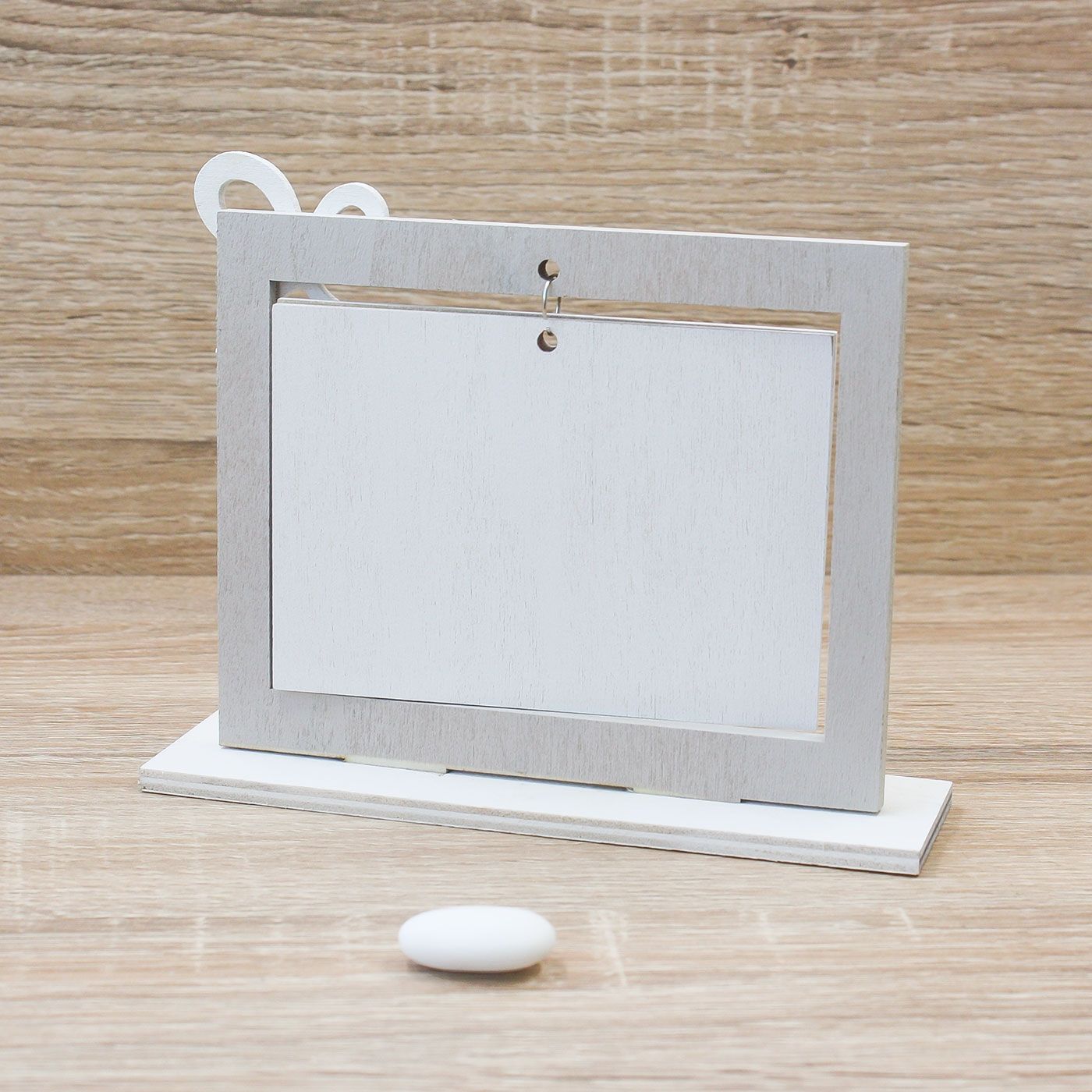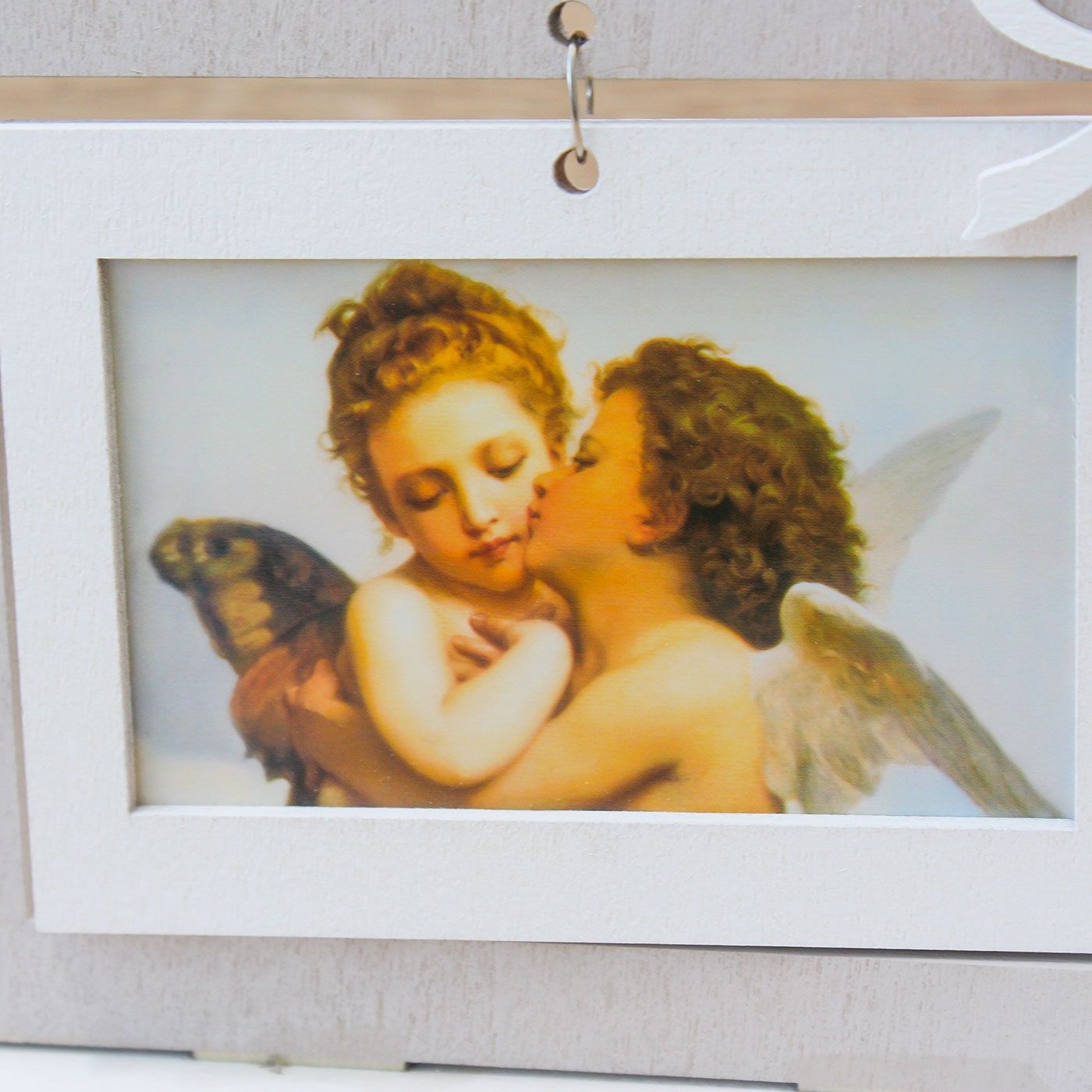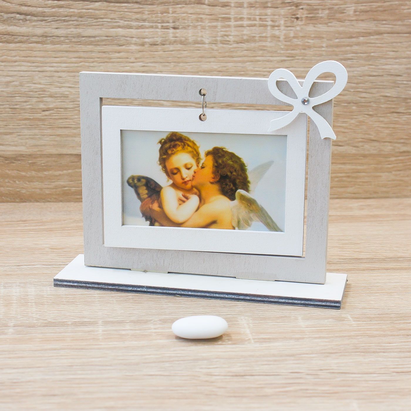 Portafoto in Legno, fiocchetto bianco con al centro uno strass e immagine di due Angioletti.