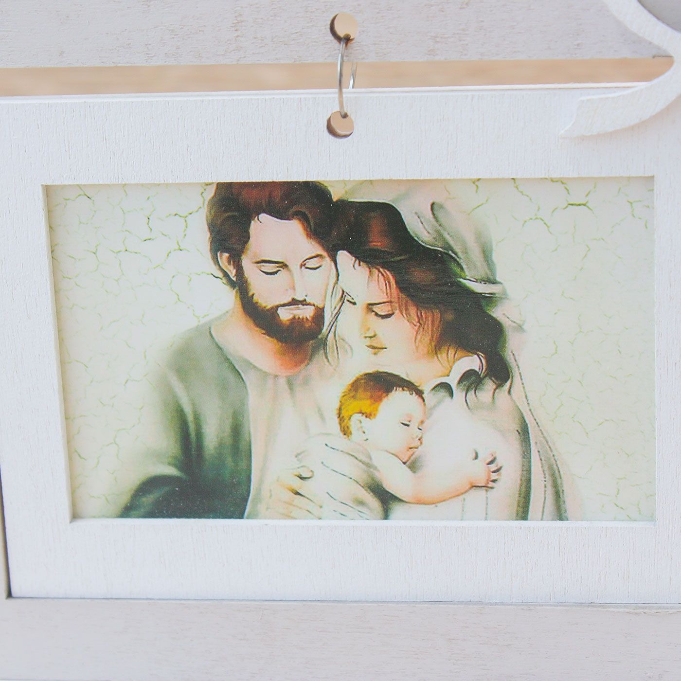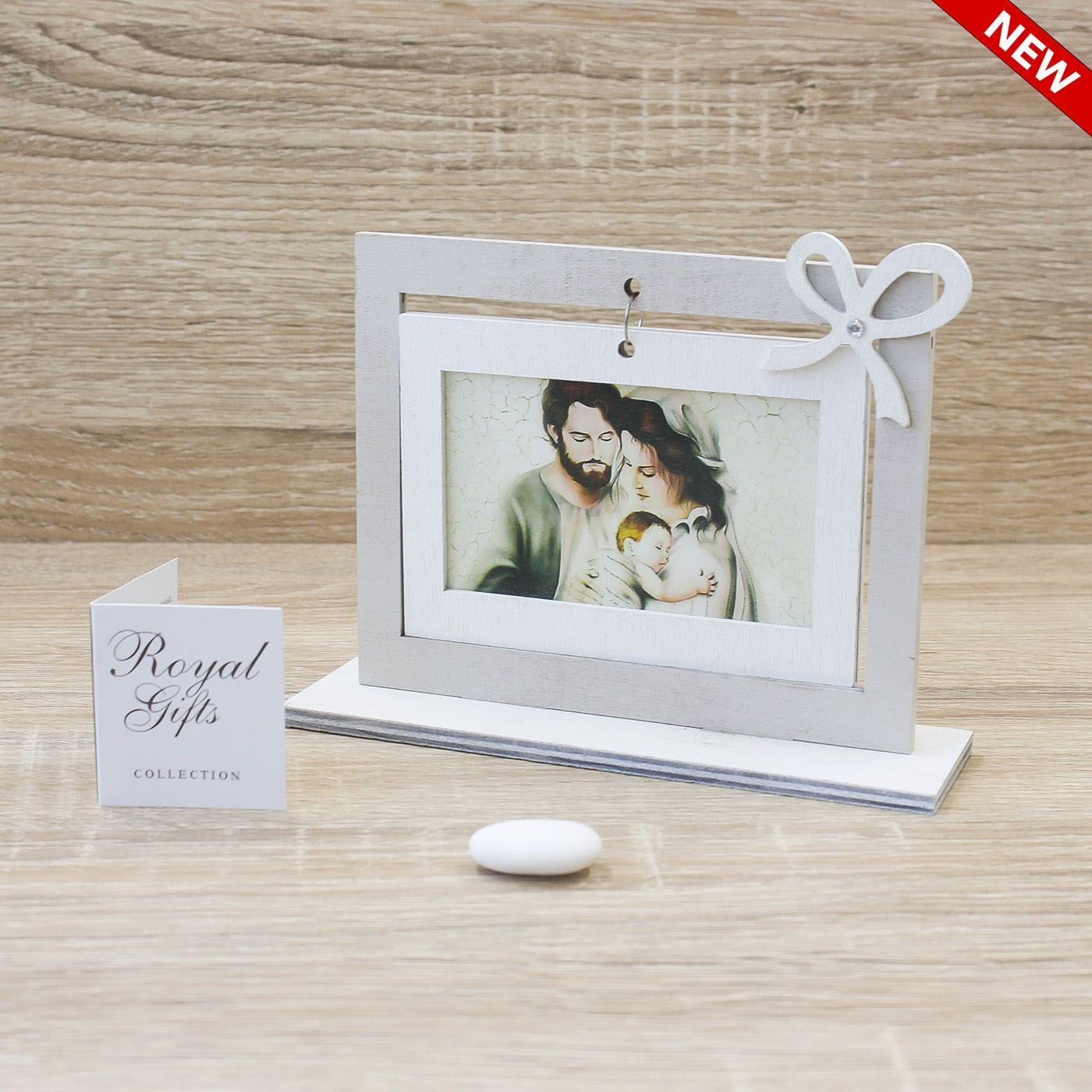 Portafoto in Legno, fiocchetto bianco con al centro uno strass e immagine della Sacra Famiglia.