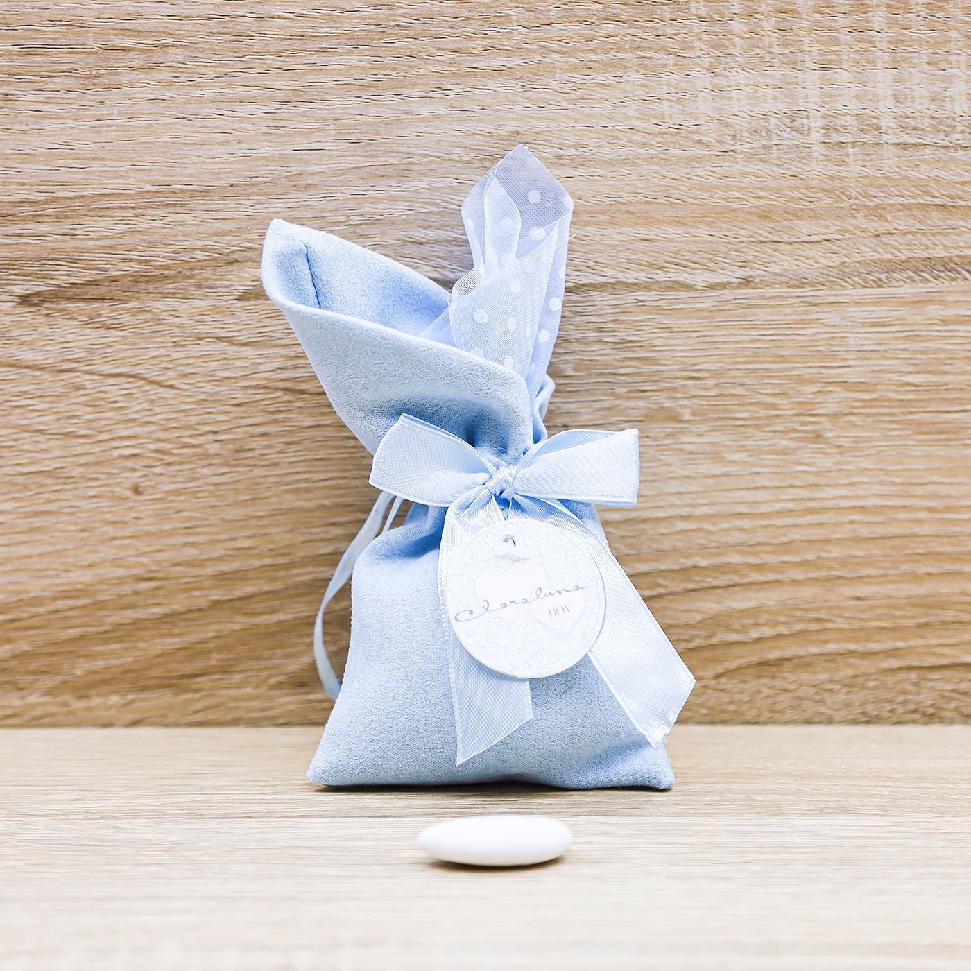 Sacchetto Celeste Piccolo in Velluto con aggiunta di un tulle a pois bianchi, fiocco in raso celeste e applicazione di una targhetta tonda con decori, scritta "Boy", firmato Claraluna.