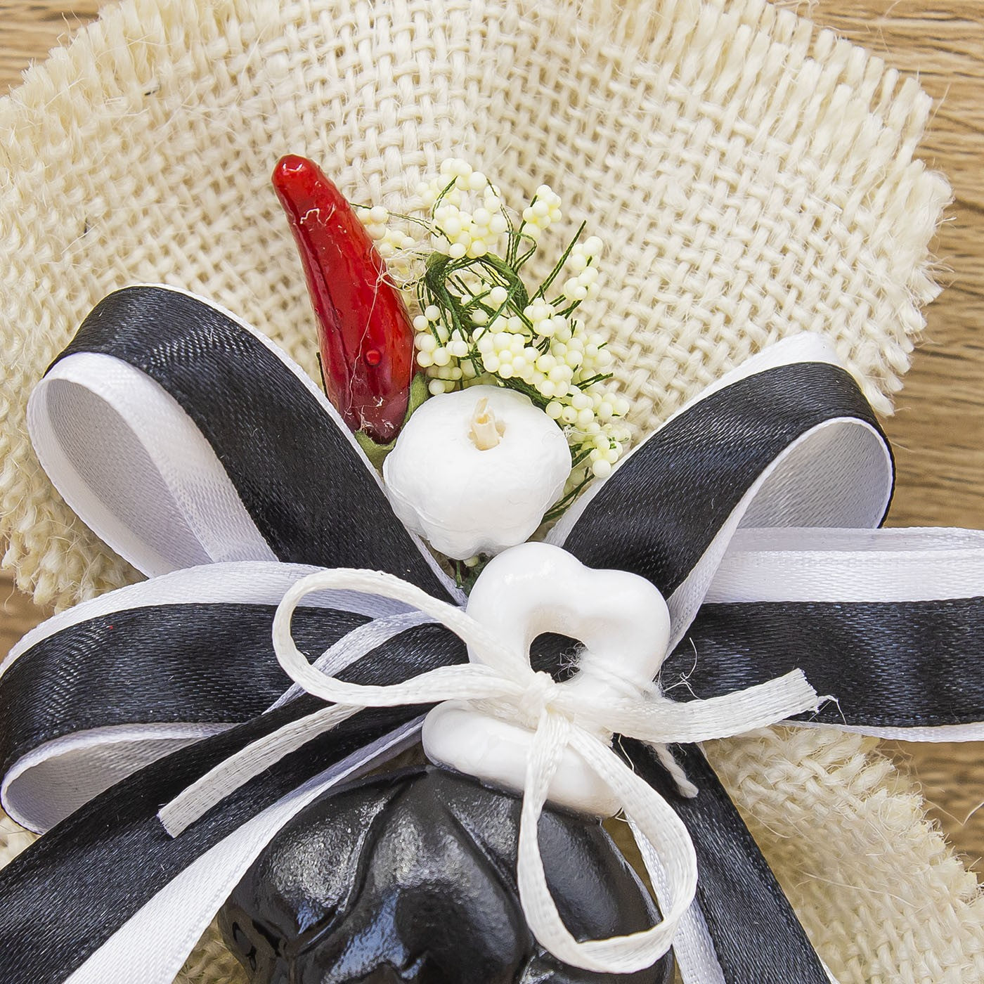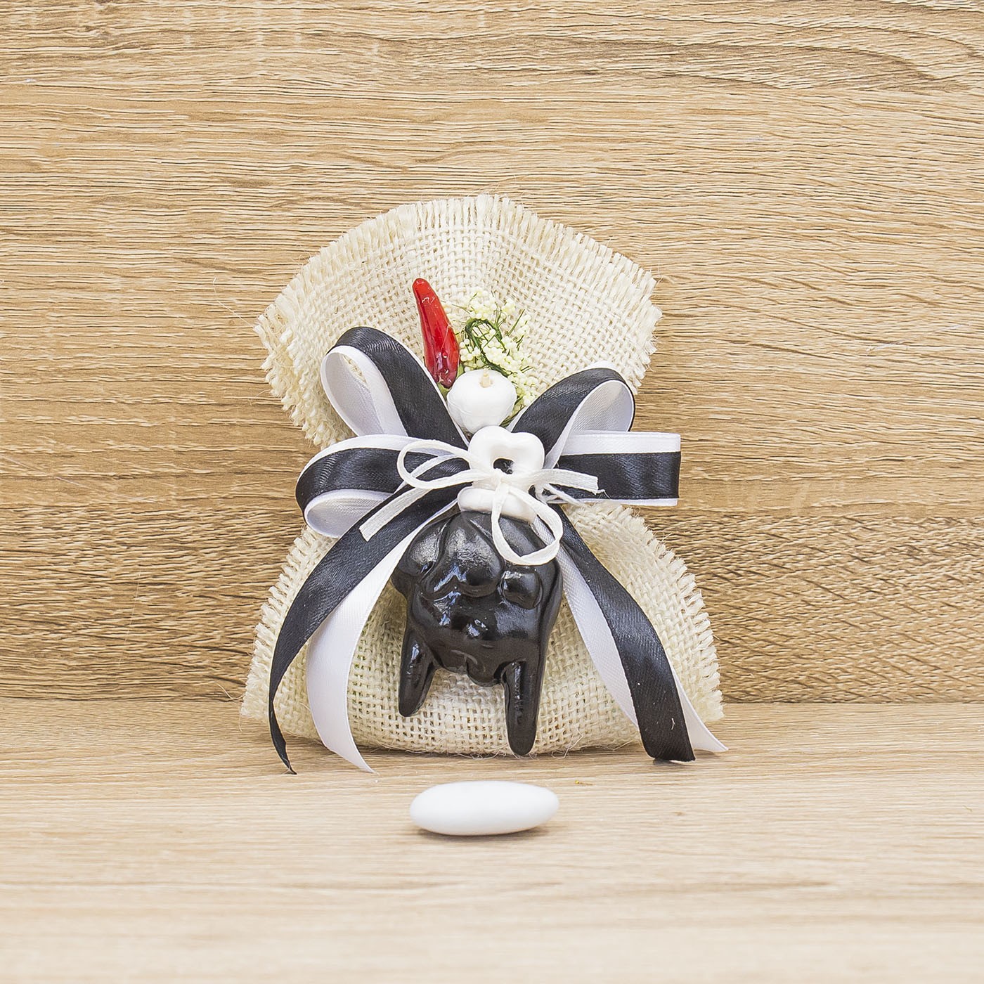 Sacchetto in Iuta con Mani Corna di colore Nero con Cuori in rilievo, doppio nastro, fiorellini, peperoncino e aglio.