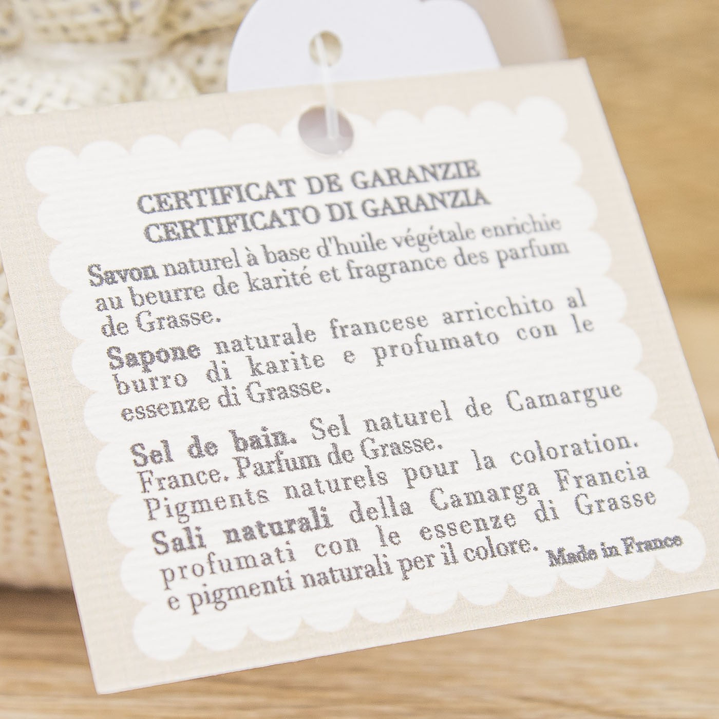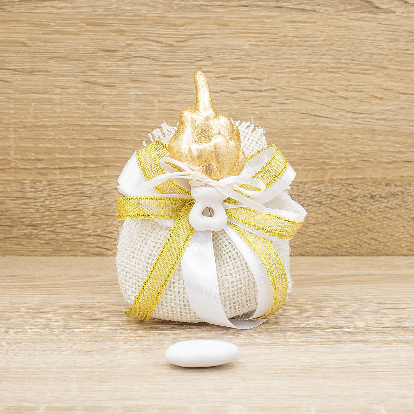 Sacchetto in Iuta con Sali Francesi Profumati, Ciondolo Dito Medio con Foglia Oro e Cuori in rilievo, doppio nastro e certificato garanzia Bomboniera Solidale e Sali Profumati.