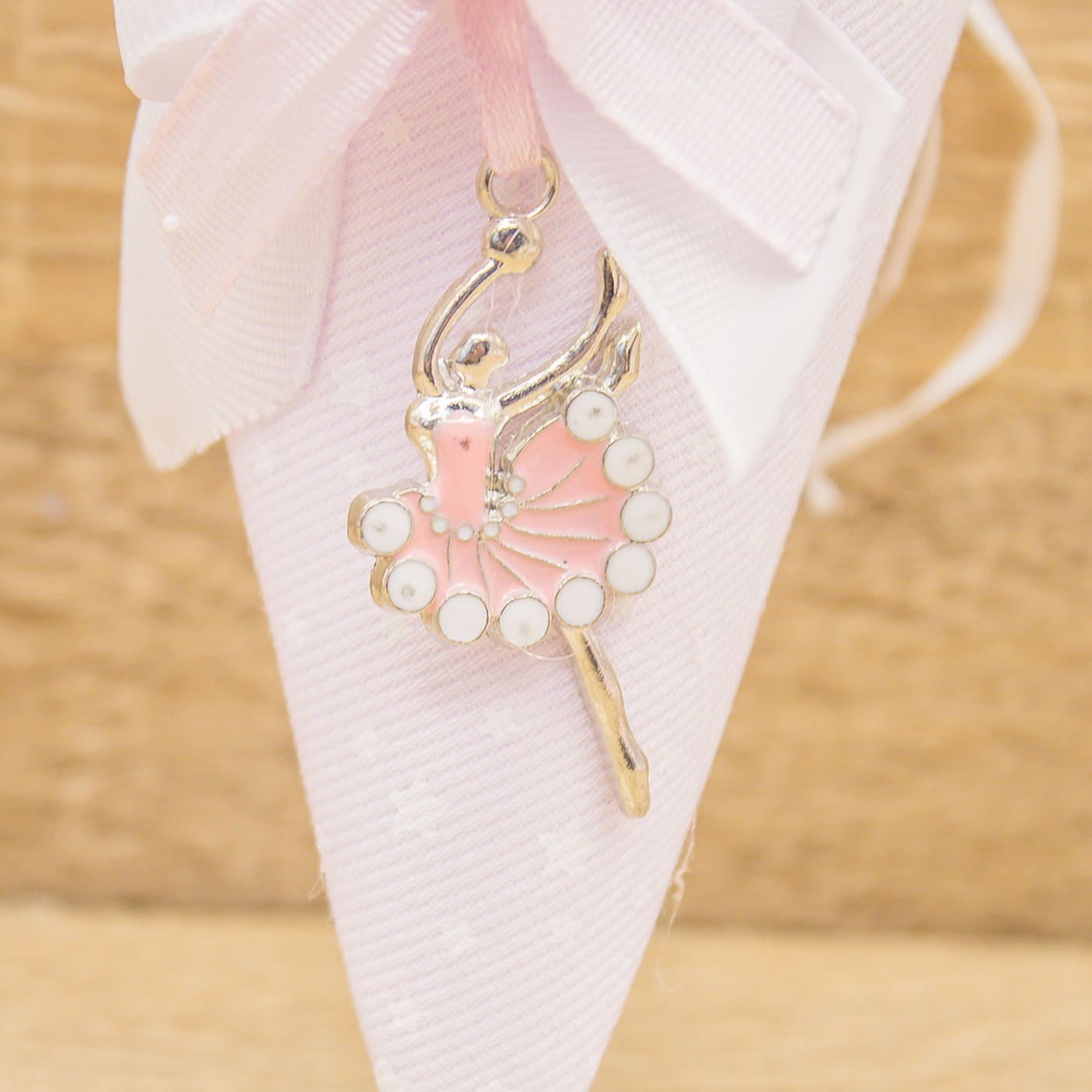 Cono Rosa, decorato con stelline bianche, fiocco con nastro in raso rosa e bianco, portaconfetti in organza bianca con bordo in raso e ciondolo di una ballerina.