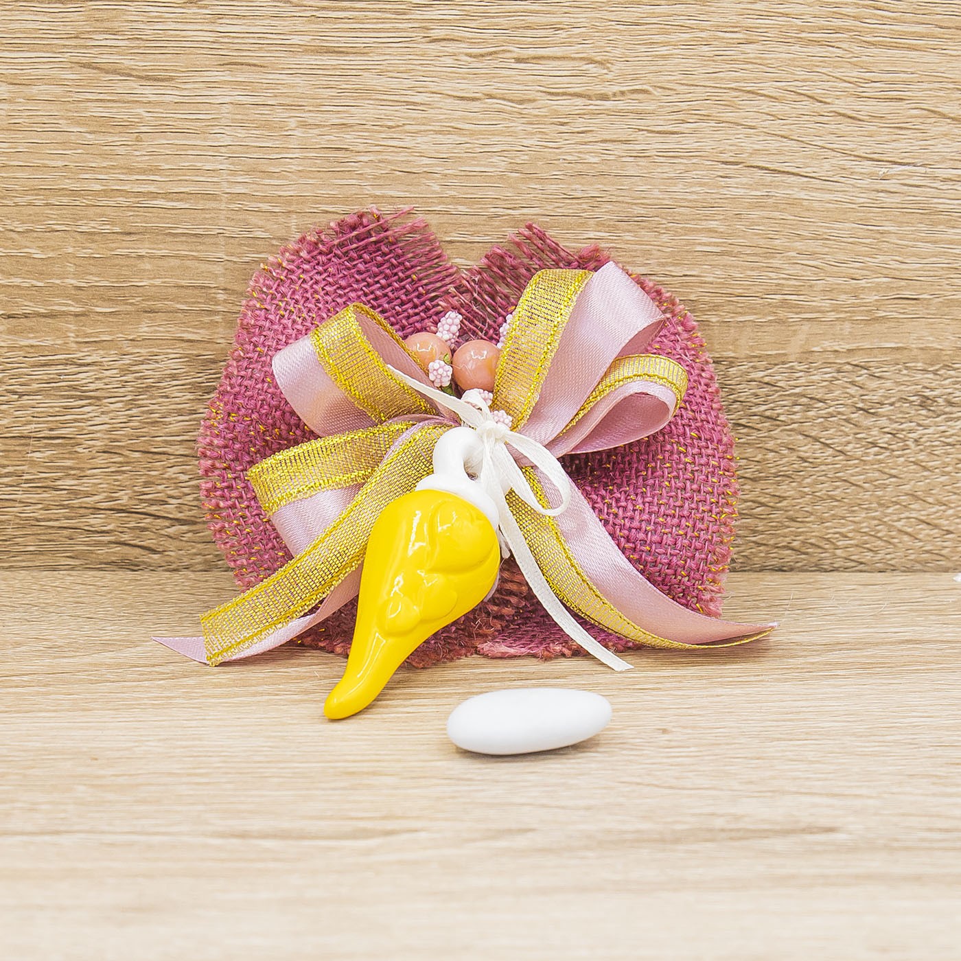 Portaconfetti in Iuta Fucsia con inserti in Oro, Ciondolo Corno Giallo con Cuori in rilievo, Doppio Nastro e fiorellini.