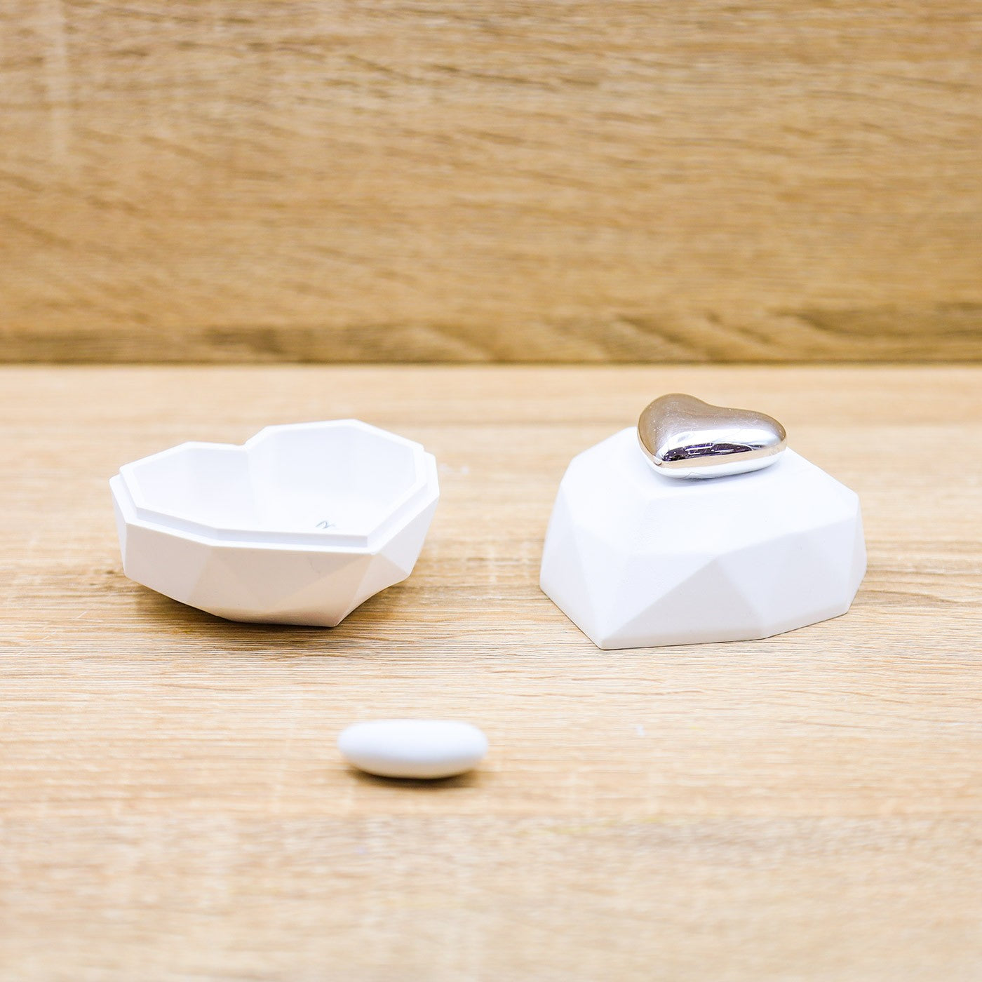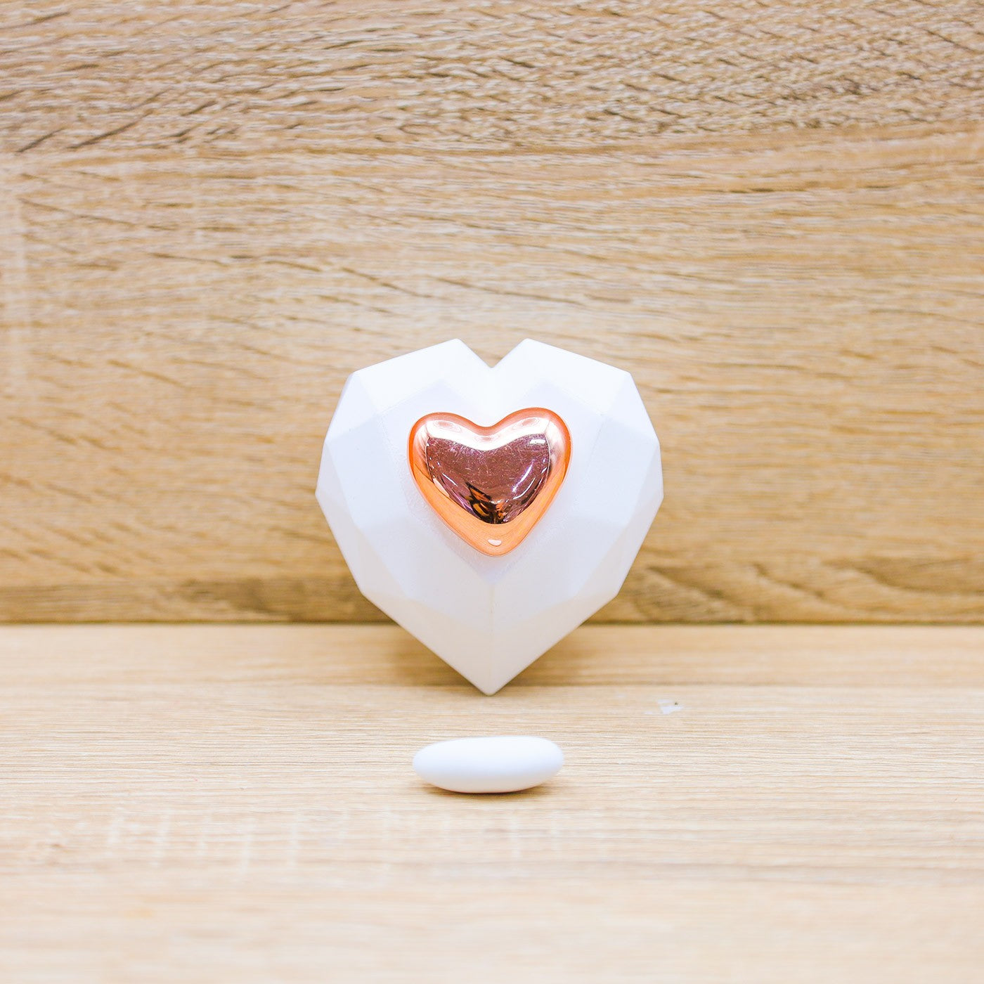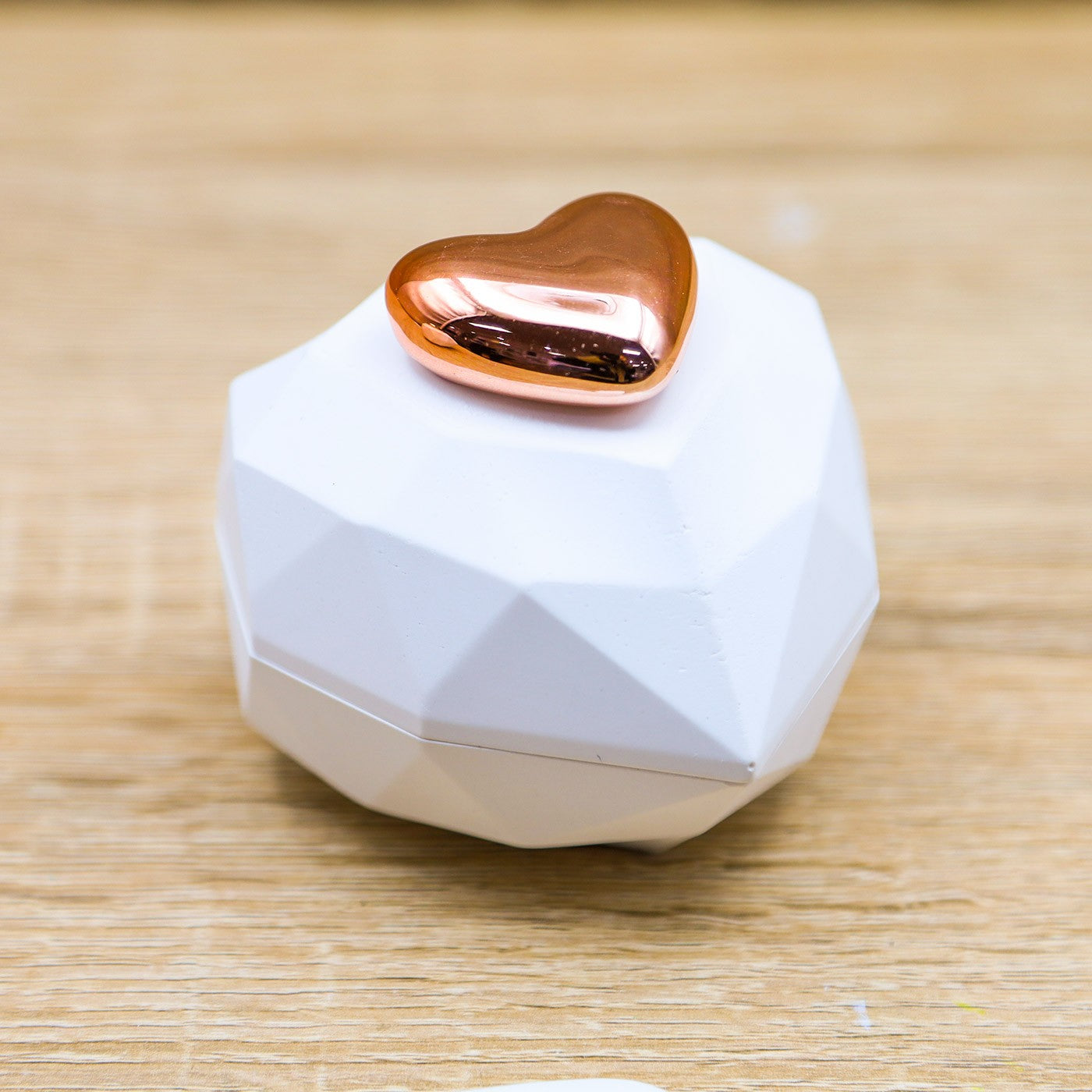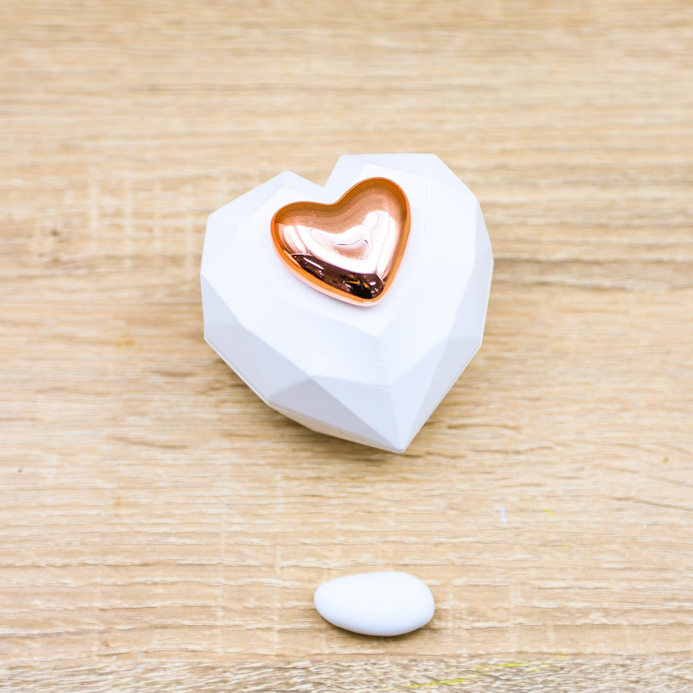 Scatolina a forma di cuore dalle linee geometriche con applicazione di un cuore oro rosa, firmato Claraluna.