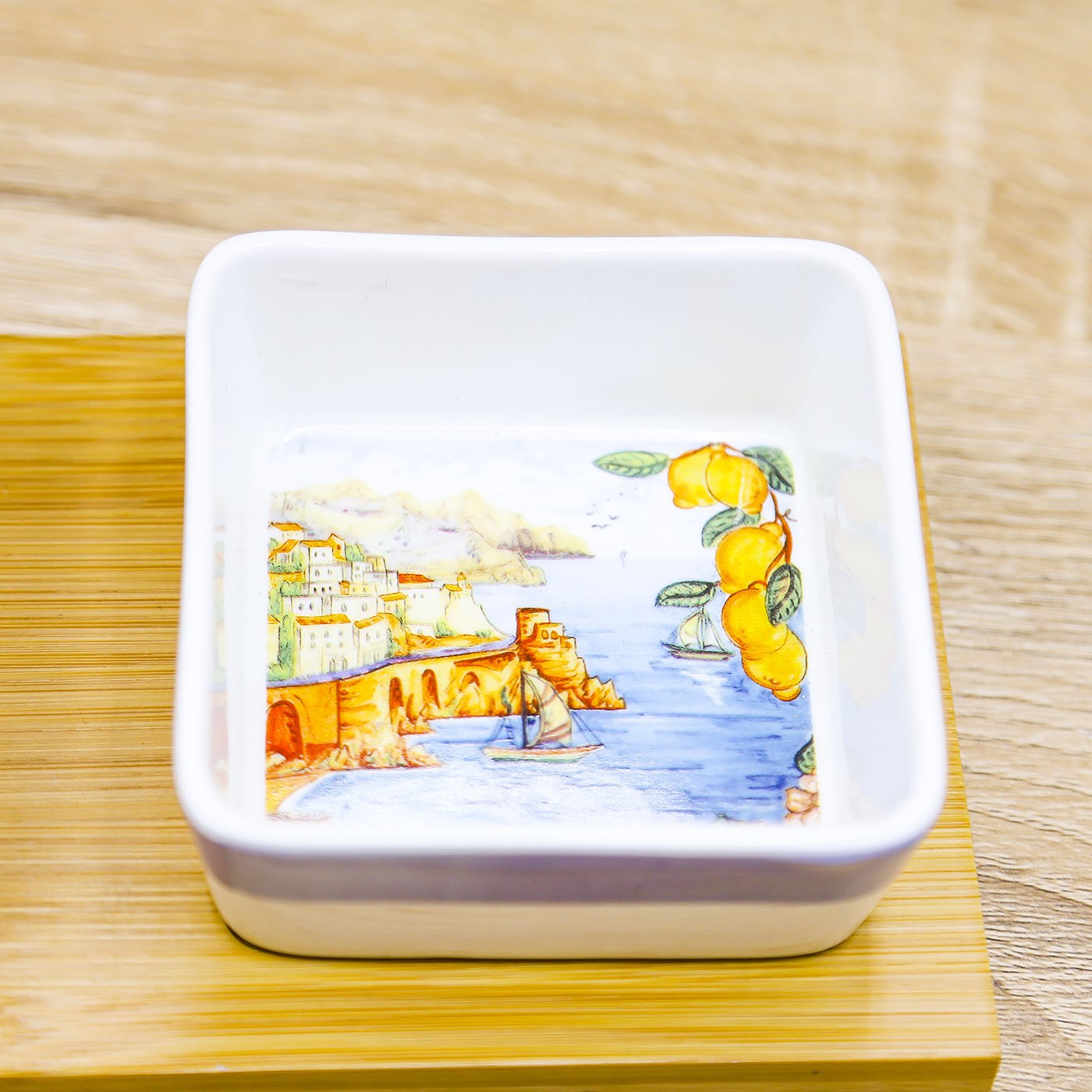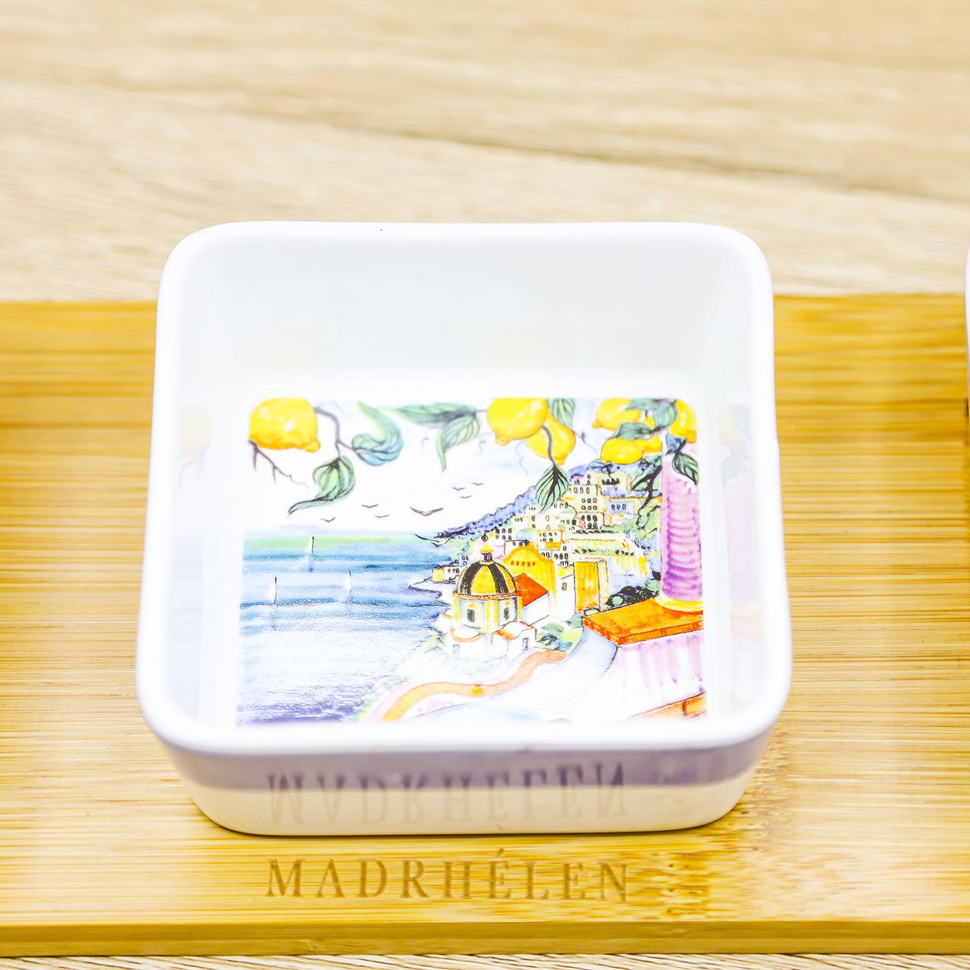 Bomboniera Utile, Antipastiera base legno e Tre Ciotole con Decoro vista Capri, firmato Madrhélen.