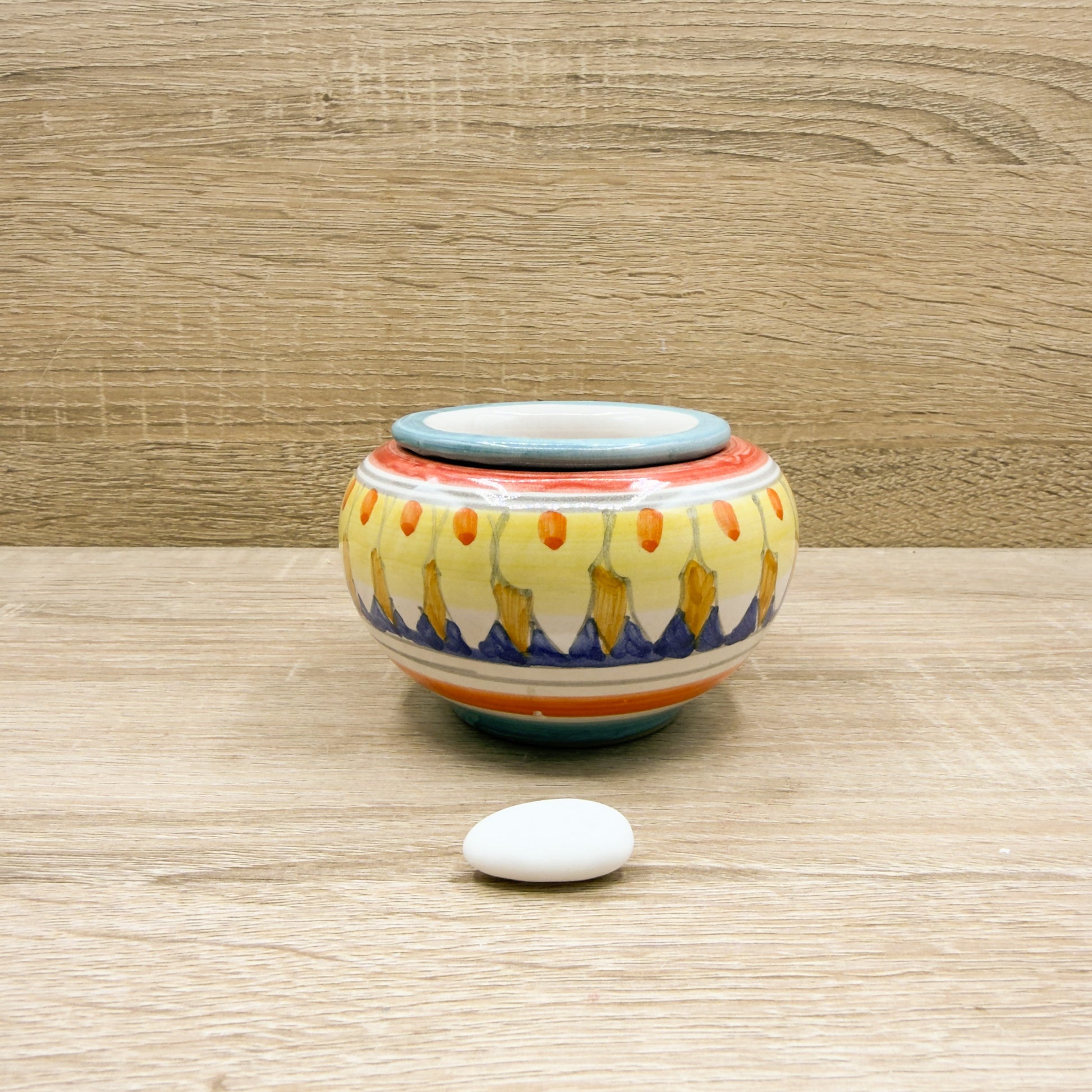 Vaso porta piantina decorato con motivi geometrici a goccia nei toni del giallo, arancio e blu, caratterizzato da un bordo superiore azzurro.